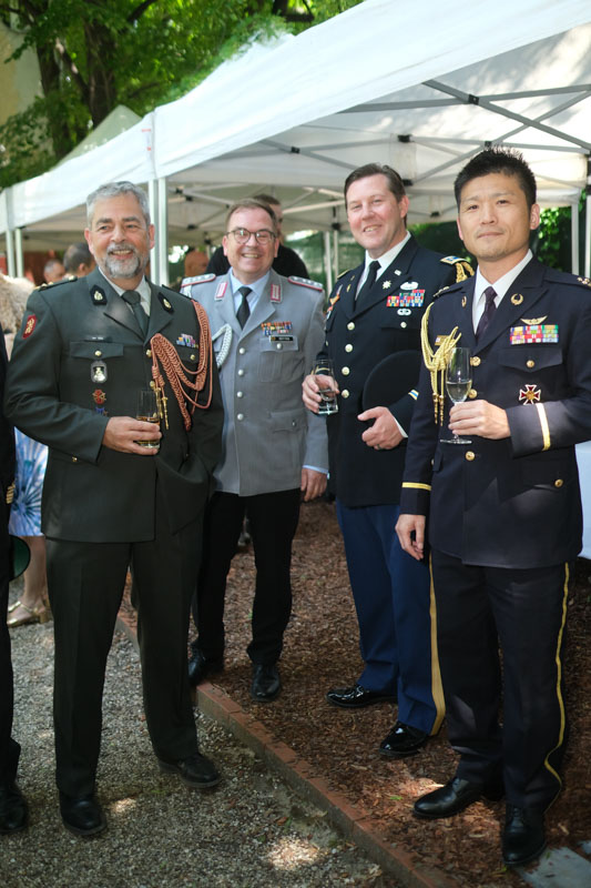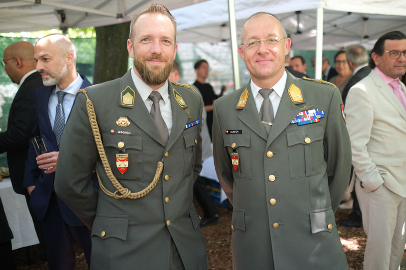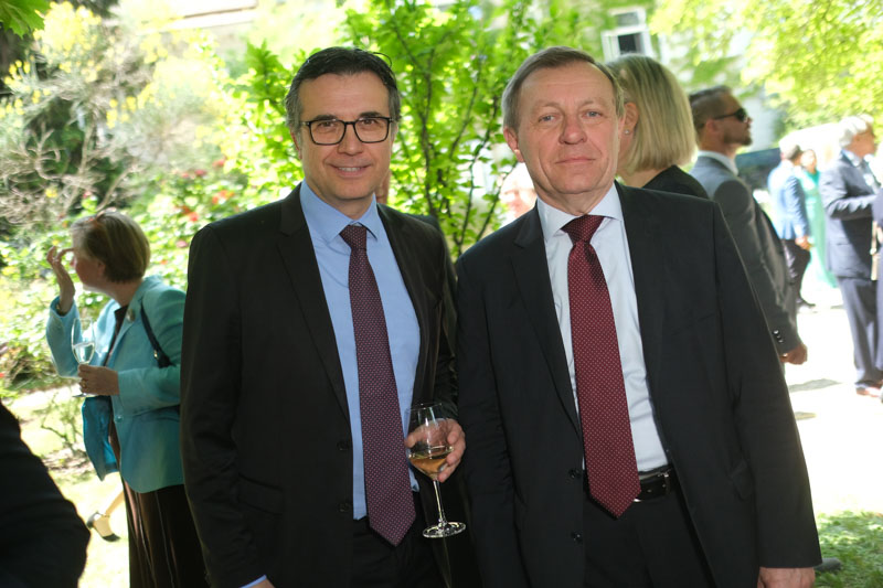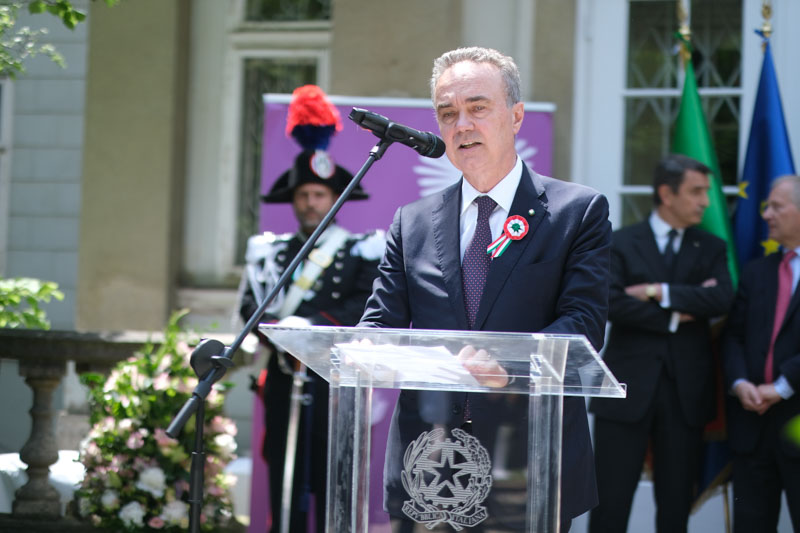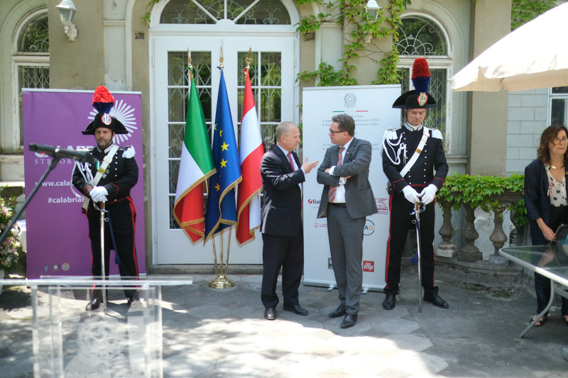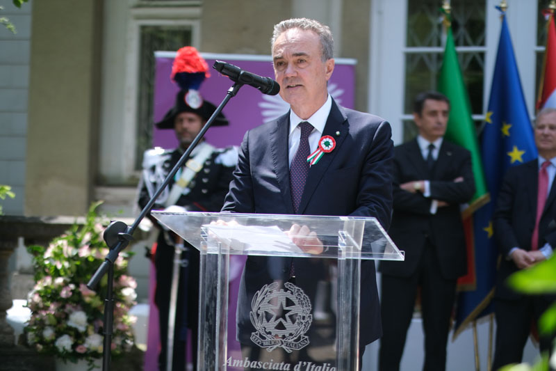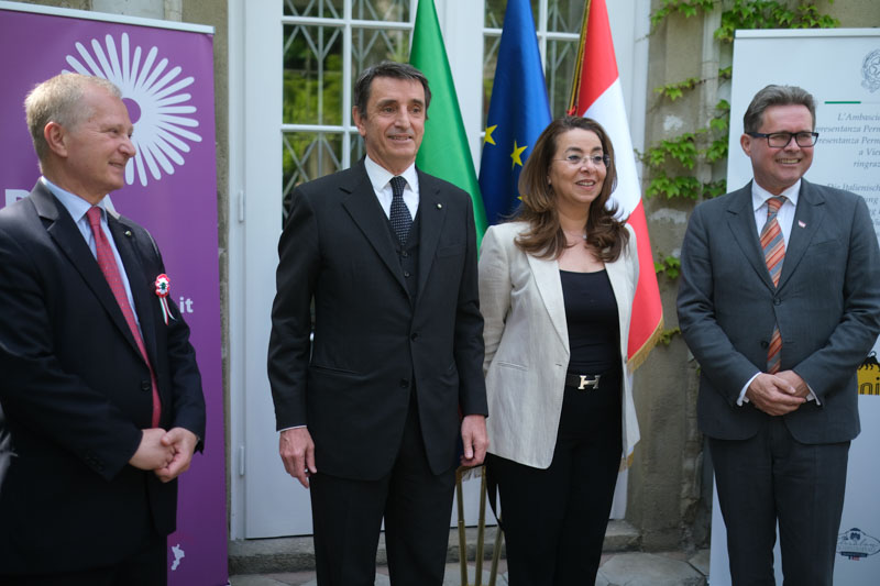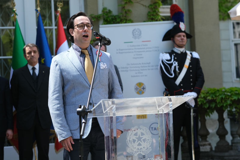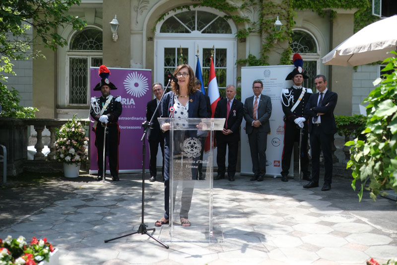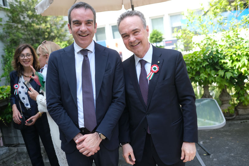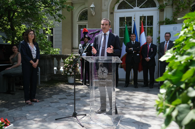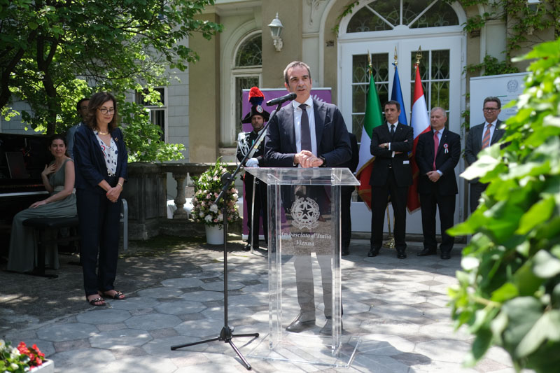 Anlässlich des Nationalfeiertages luden S.E. Stefano Beltrame, Botschafter der Republik Italien, S.E. Alessandro Cortese, ständiger Vertreter bei den Internationalen Organisationen und S.E. Stefano Baldi, ständiger Vertreter bei der OSZE, zu einem Empfang in den Garten des italienischen Kulturinstitutes.