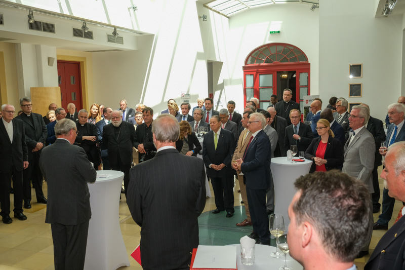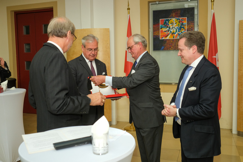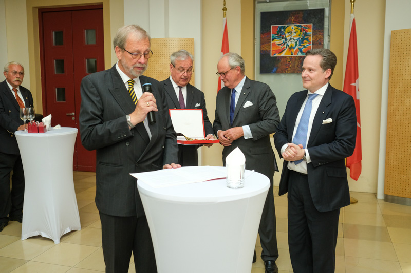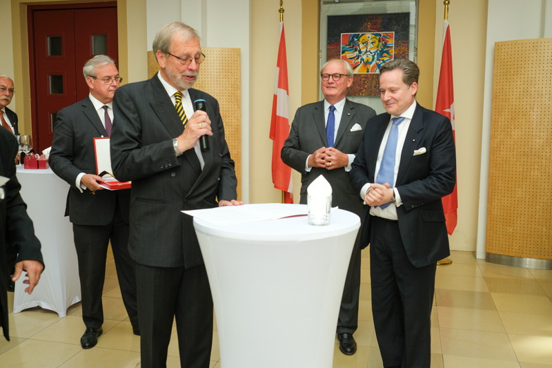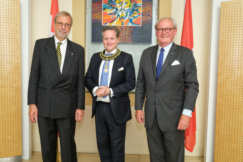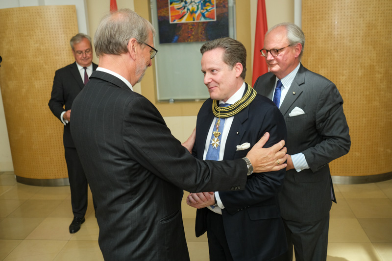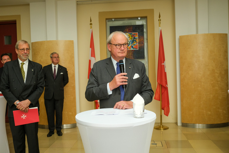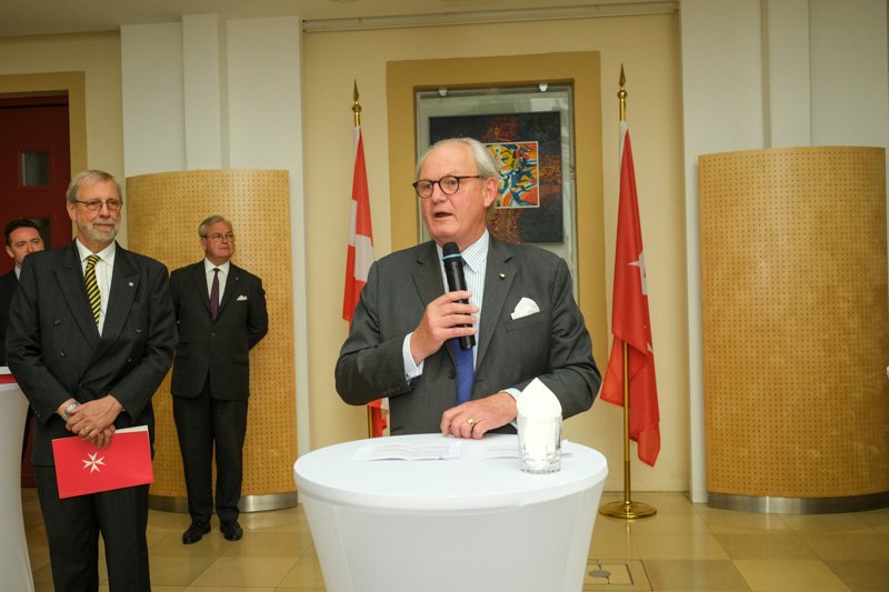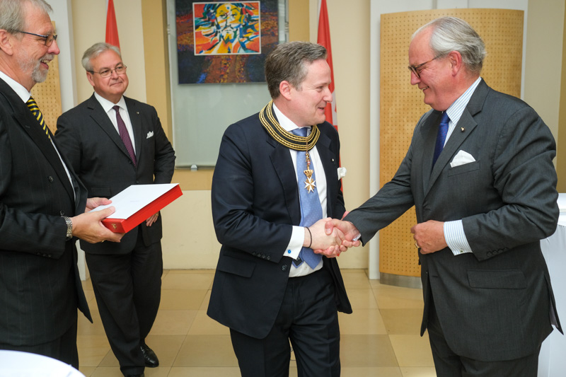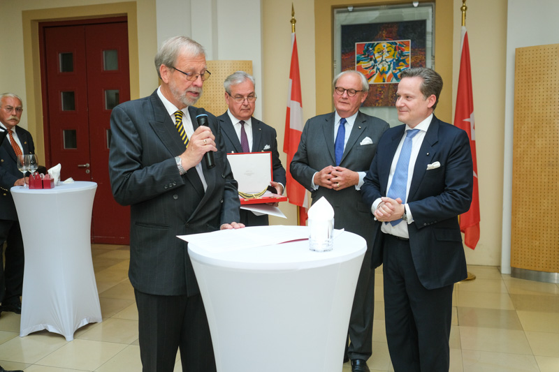 Der Botschafter des Souveränen Malteser-Ritterordens bei der Republik Österreich, S.E. Sebastian Prinz von Schoenaich-Carolath, und der Großprior des Großpriorats von Österreich, Fra‘ Gottfried Kühnelt-Leddihn, luden anlässlich des Patroziniums des Hl. Johannes des Täufers, des Schutzpatrons des Ordens, zum gemeinsamen Empfang ins Curhaus St. Stephan. Im Zuge des Botschaftsempfangs überreichte der Großprior des Souveränen Malteser-Ritter-Ordens in Österreich, Fra‘ Gottfried Kühnelt-Leddihn, dem Gesandten und bevollmächtigten Minister Mag. Constantin von Hoheneck, in Anerkennung seiner besonderen Verdienste im diplomatischen Dienst des Ordens das Gratial- und Devotions-Großkreuz.