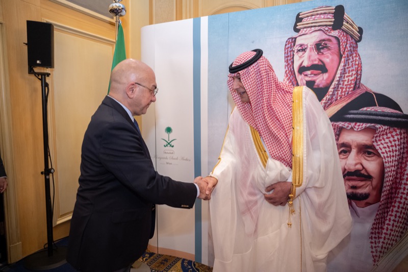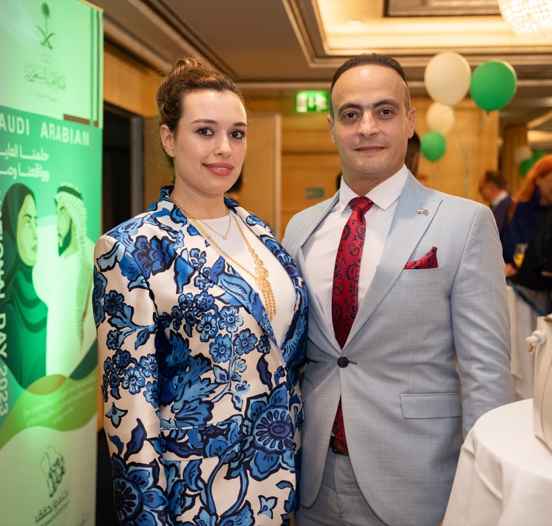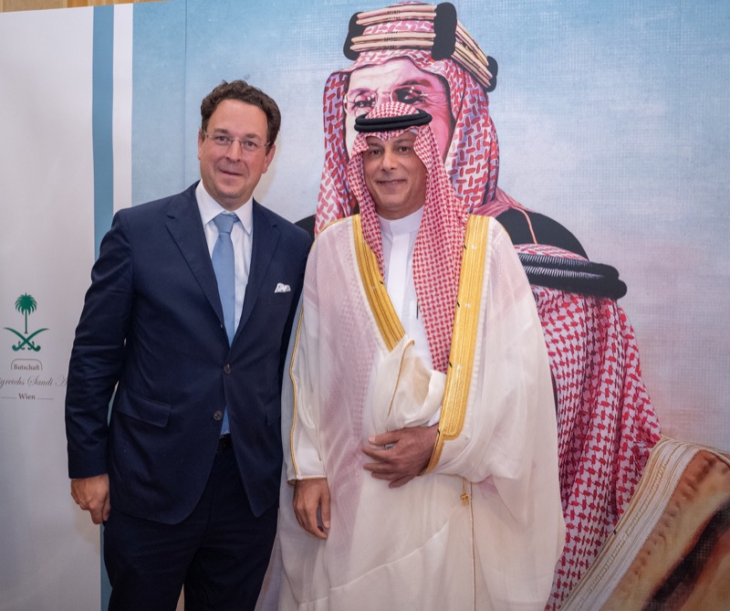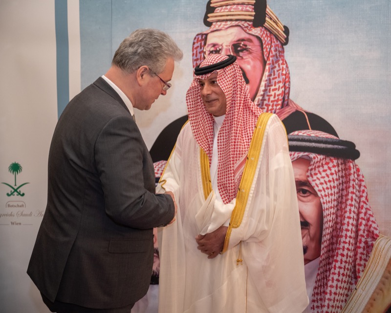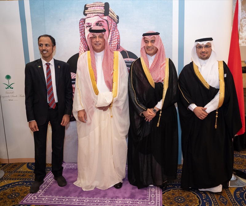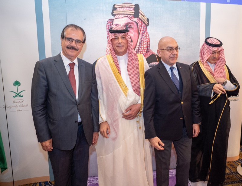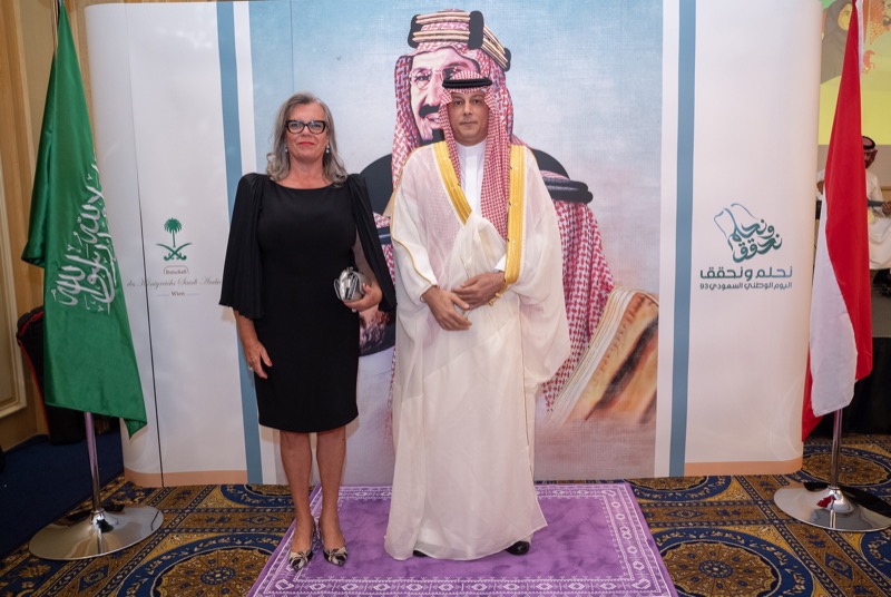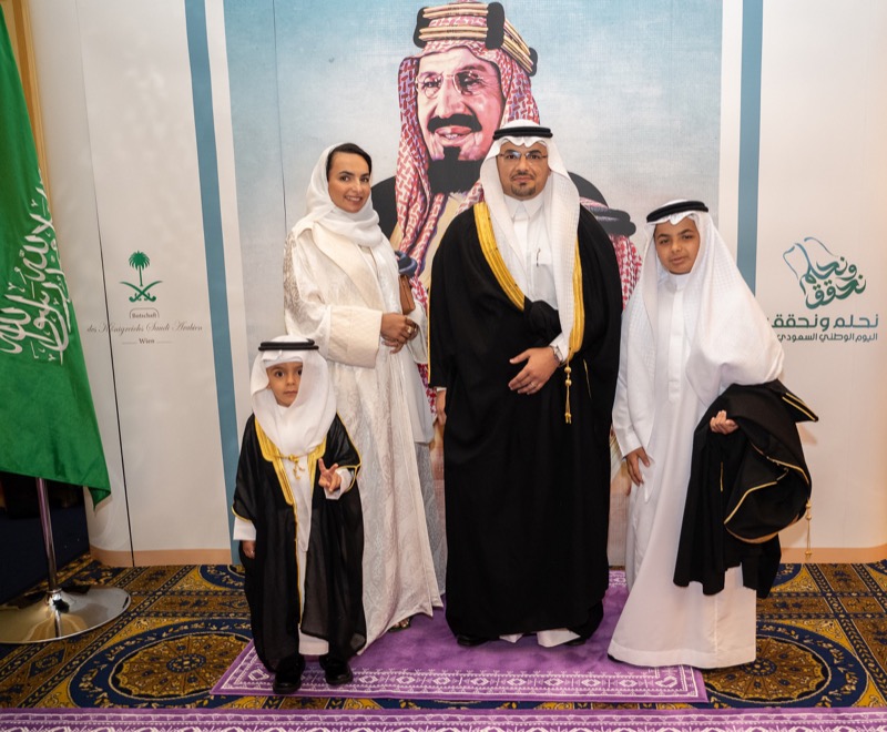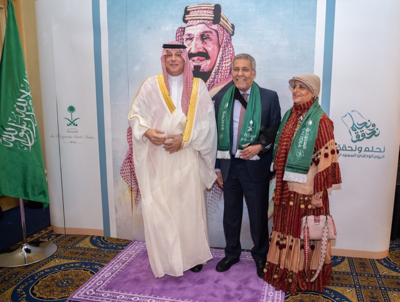 Anlässlich des 93. Nationalfeiertages luden der designierte Botschafter und ständige Vertreter bei den internationalen Organisationen des Königreichs Saudi Arabien, H.E. Abdullah Bin Khalid Tawlah, und Frau Marwah Mohammed A. Bederi, zu einem Empfang.