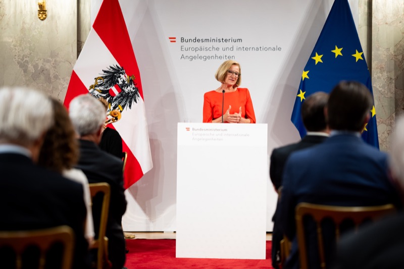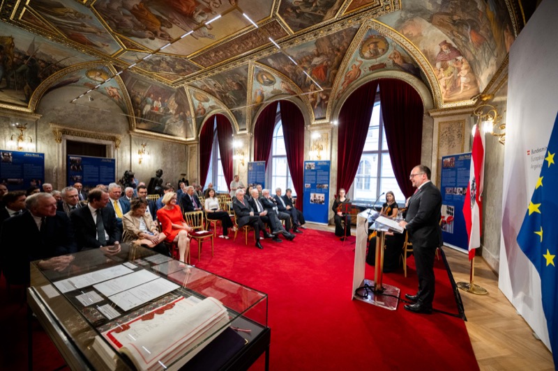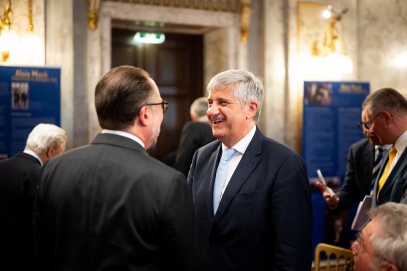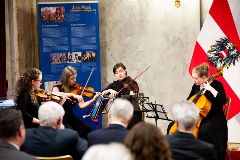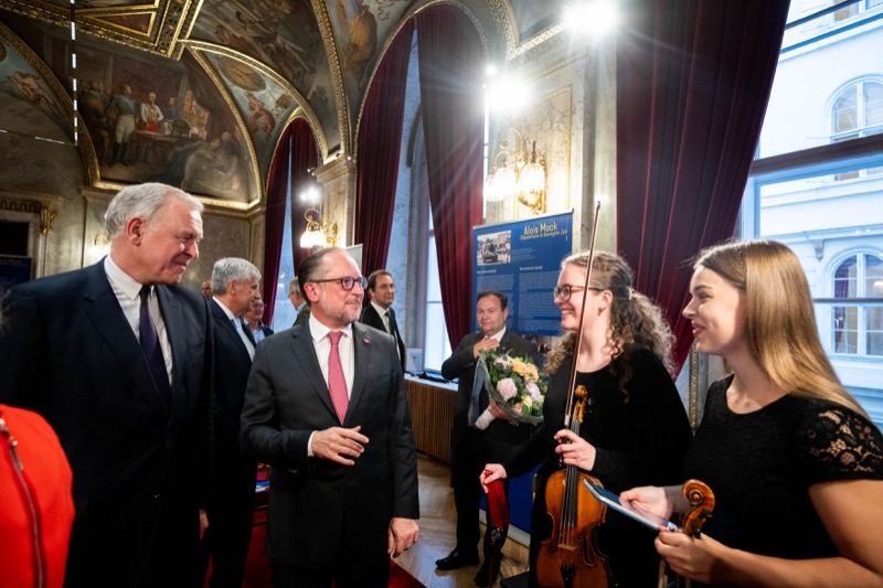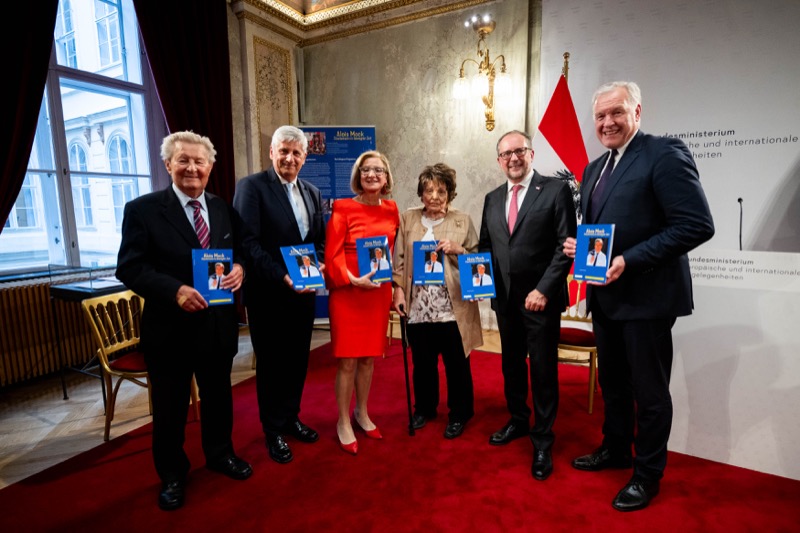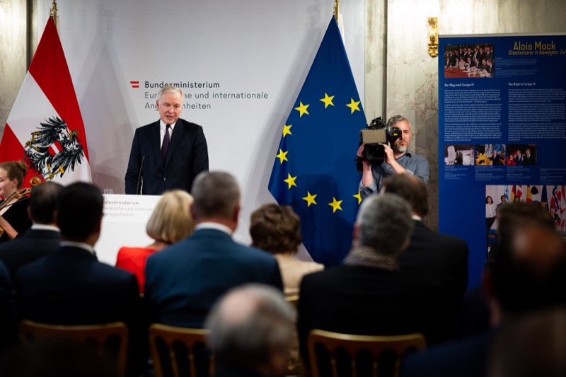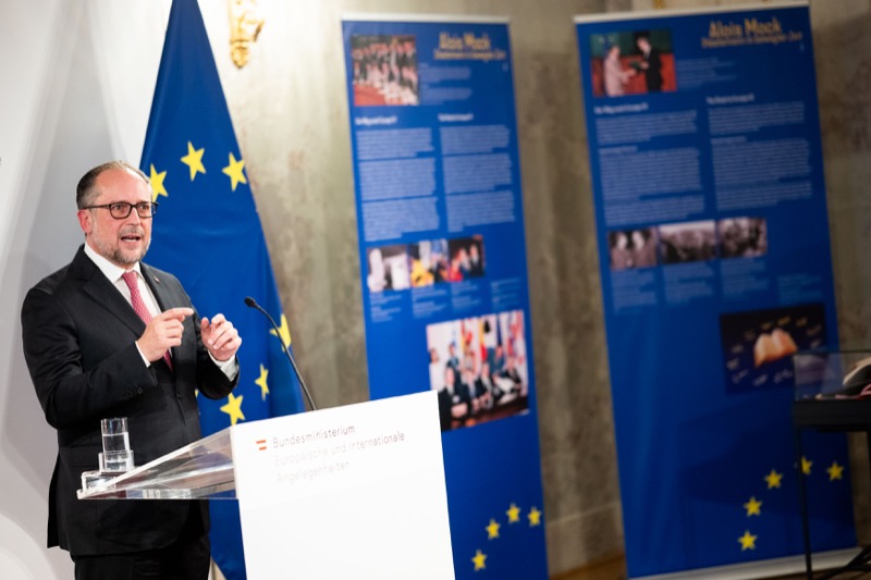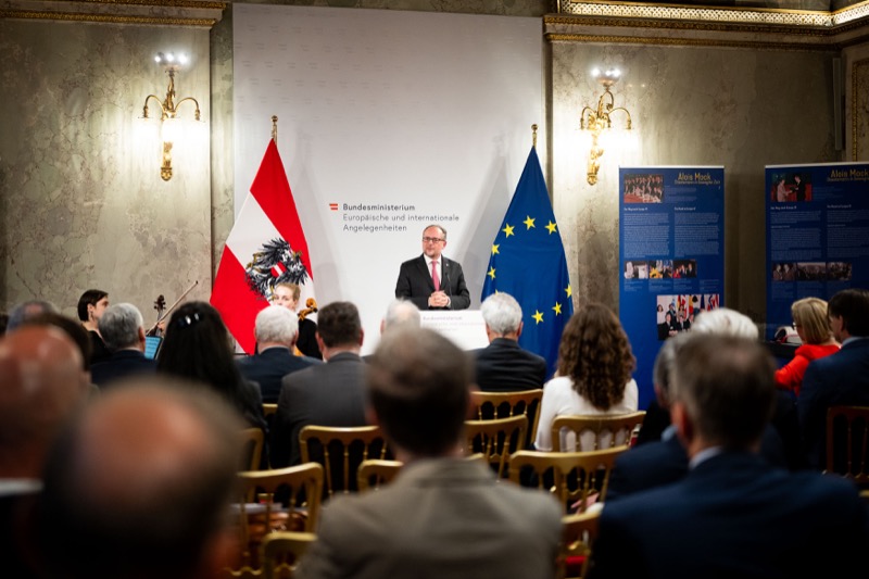 Gemeinsam mit Landeshauptfrau Johanna Mikl-Leitner lud Außenminister Alexander Schallenberg am 21. Mai zum Festakt und zur Präsentation der Ausstellung „Alois Mock. Staatsmann in bewegten Zeiten“ in den Alois-Mock-Saal im Außenministerium. Gemeinsam wurde nicht nur der 90. Geburtstag des außergewöhnlichen Staatsmannes Alois Mock gefeiert, sondern auch das 30. Jubiläum des österreichischen EU-Referendums. Das European Union Youth Orchestra eröffnet die Feierlichkeiten mit der Europahymne und begleitet den Festakt mit Stücken aus der Salzburger Symphonie.