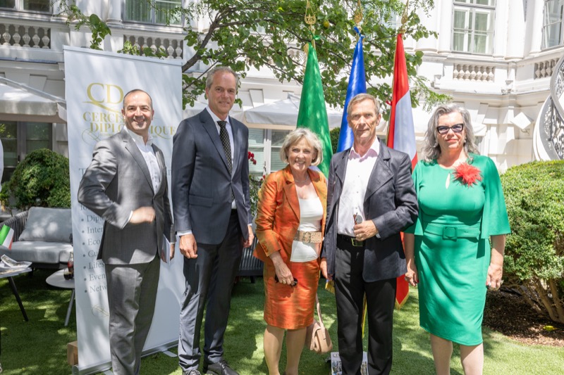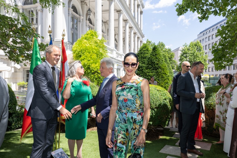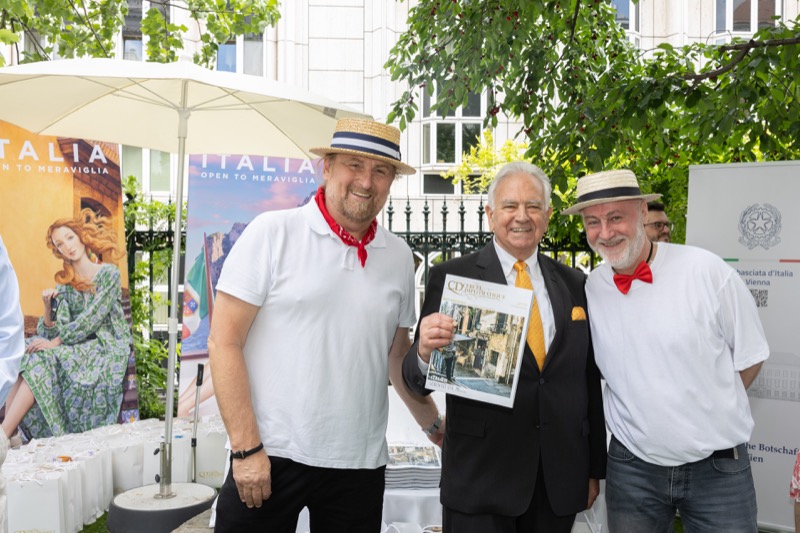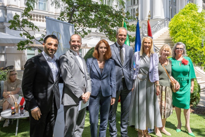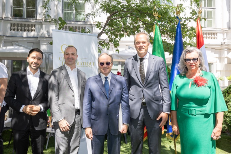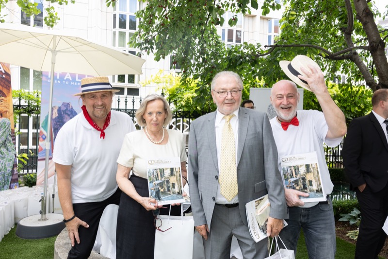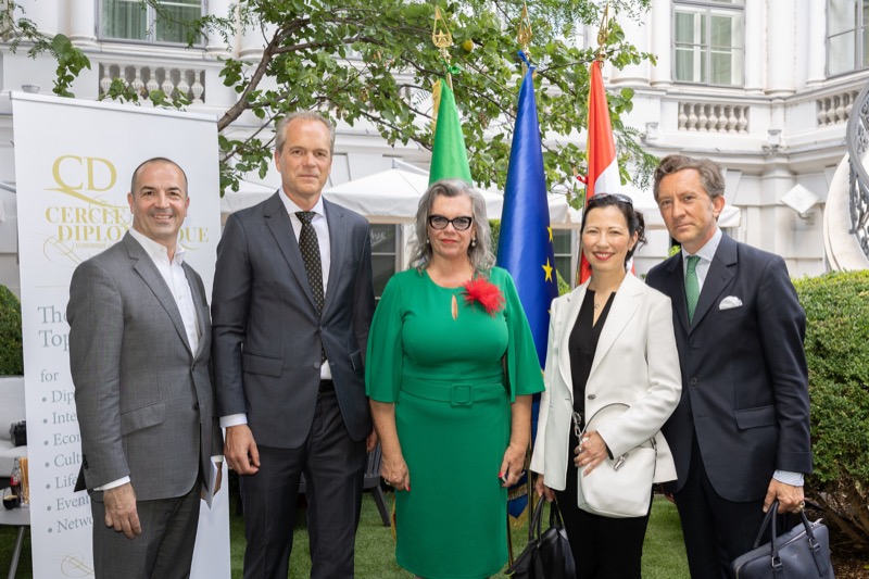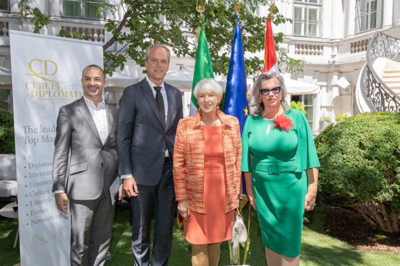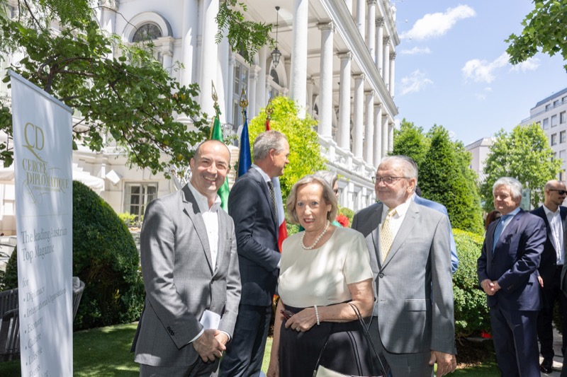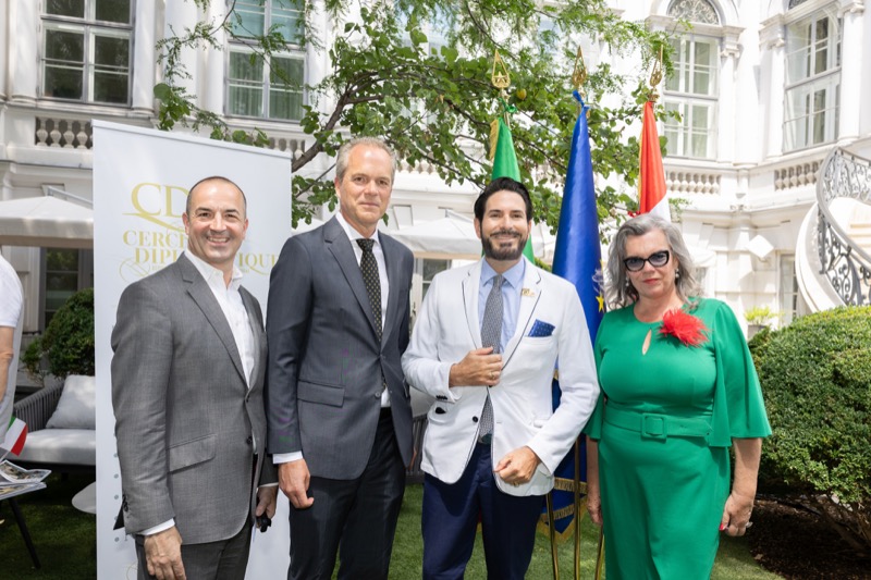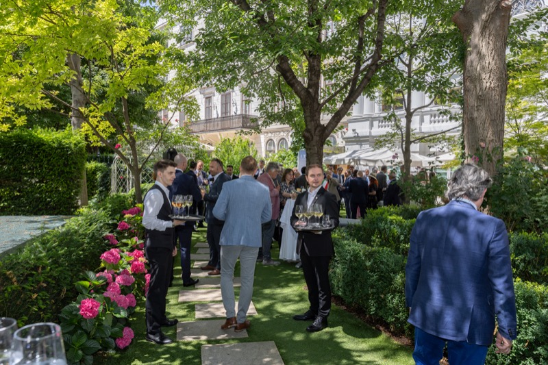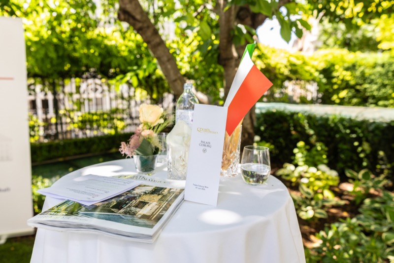 Bei traumhaftem Wetter luden die Herausgeber von CERCLE DIPLOMATIQUE, Andrea Fürnweger und Alexander Bursky, zur Präsentation der Sommerausgabe des Magazins mit der Coverstory über Italien. Gemeinsam mit Resident Manager Jochen Manninger wurden die Gäste diesmal im privaten Garten des prachtvollen Palais Coburg empfangen.
