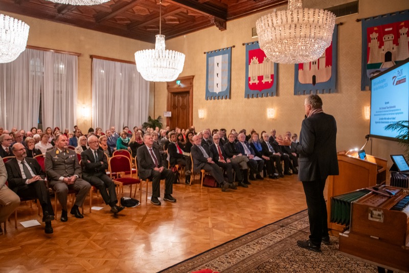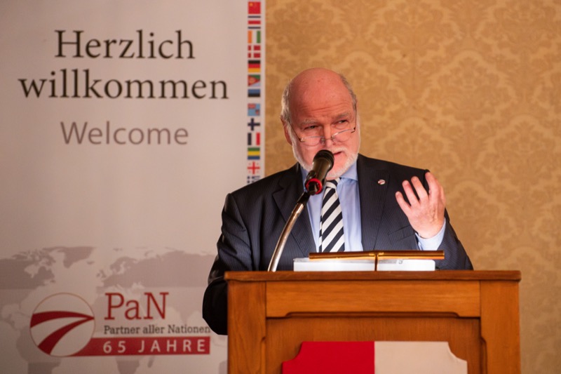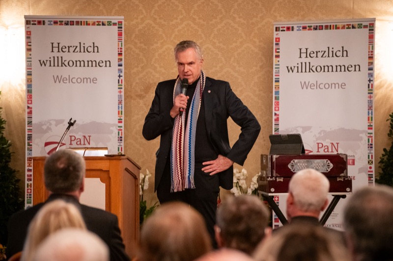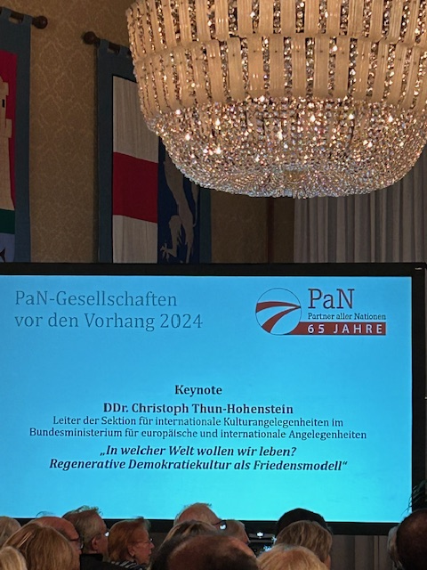 Nach der Begrüßung in Vertretung des Bürgermeisters durch LAbg. GR Mag. Michael Aichinger und den Präsidenten des Dachverbands-PaN, Univ.-Prof. Dr. Hermann Mückler, hielt Botschafter DDr. Christoph Thun-Hohenstein, Leiter für internationale Kulturangelegenheiten im Bundesministerium für europäische und internationale Angelegenheiten, den Eröffnungsvortrag »In welcher Welt wollen wir leben? Regenerative Demokratiekultur als Friedensmodell«.