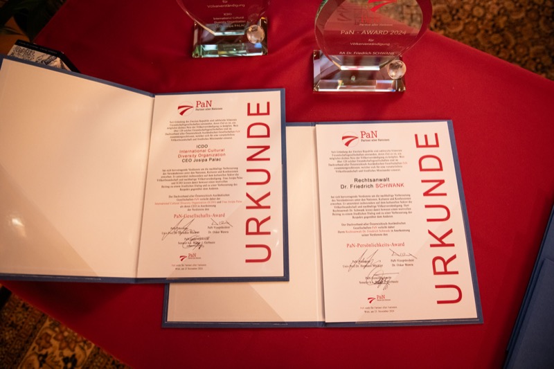 Die drei PaN-Projektunterstützungspreise 2024 gingen an die Österreich-Afghanische Gesellschaft, die Österreichisch-Brasilianische Gesellschaft und die Österreichisch-Bulgarische Gesellschaft, der PaN-Gesellschaftspreis 2024 an die ICDO – International Cultural Diversity Organization und der PaN-Persönlichkeitspreis 2024 an Anwalt Dr. Friedrich Schwank für seine Verdienste um den Dachverband-PaN.