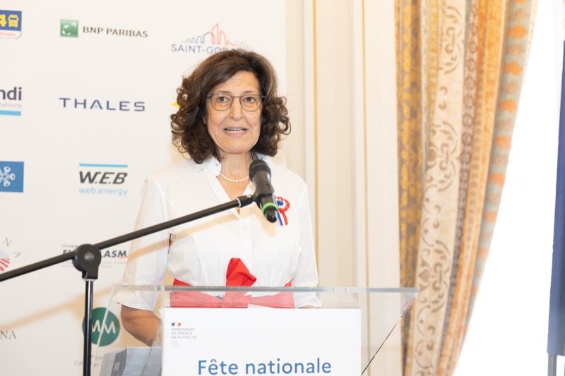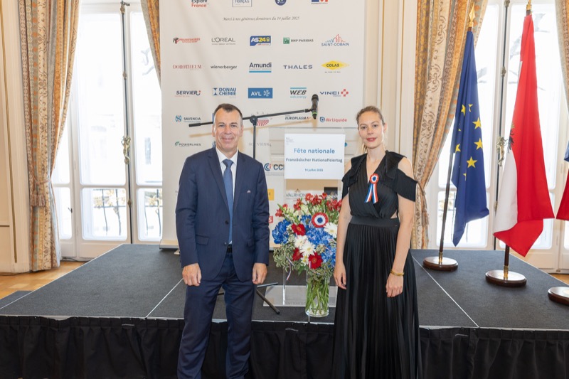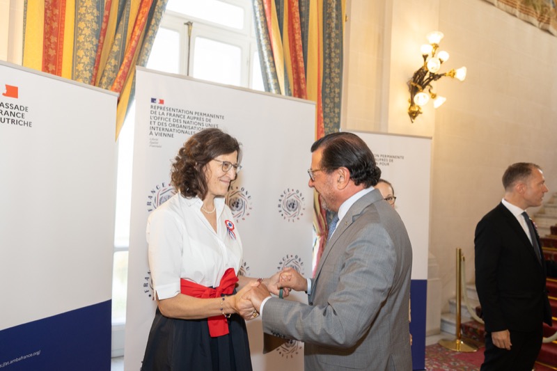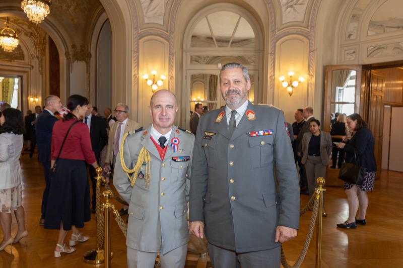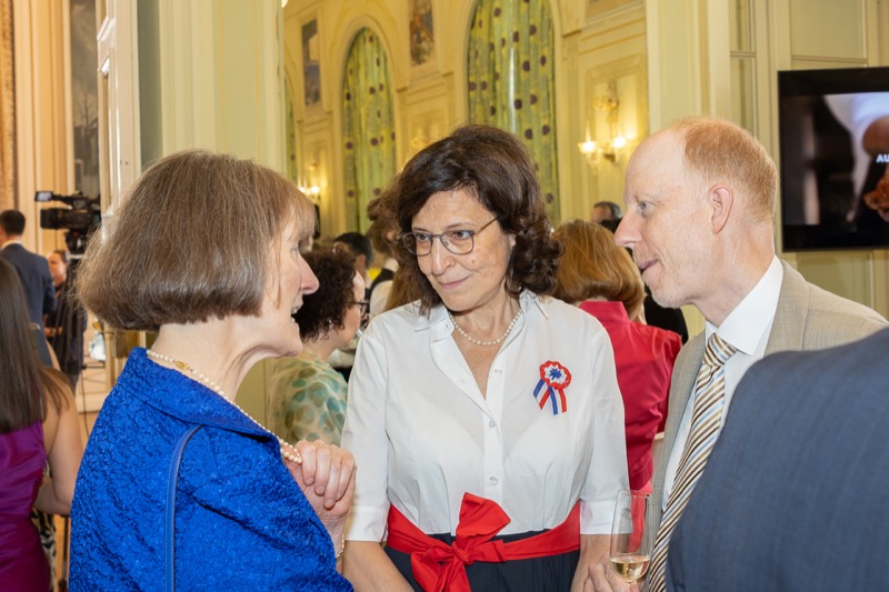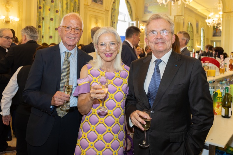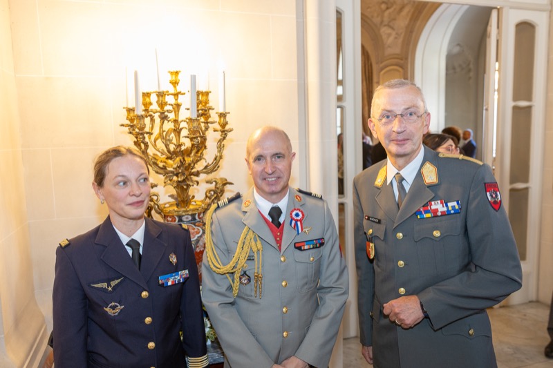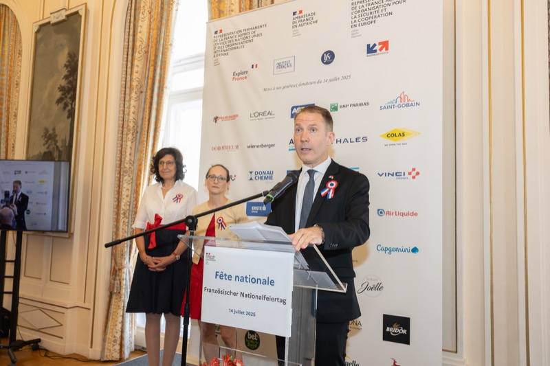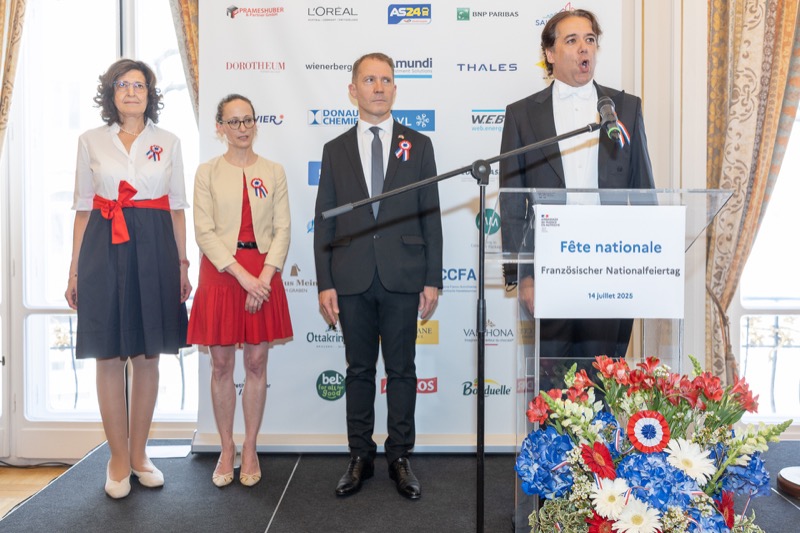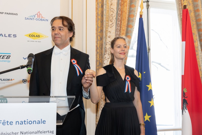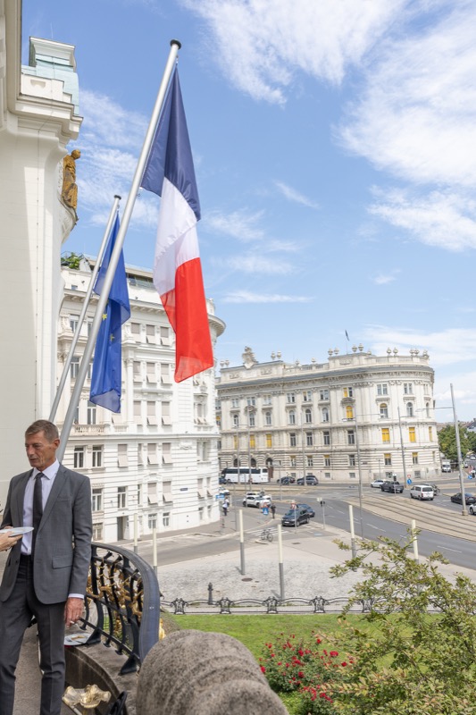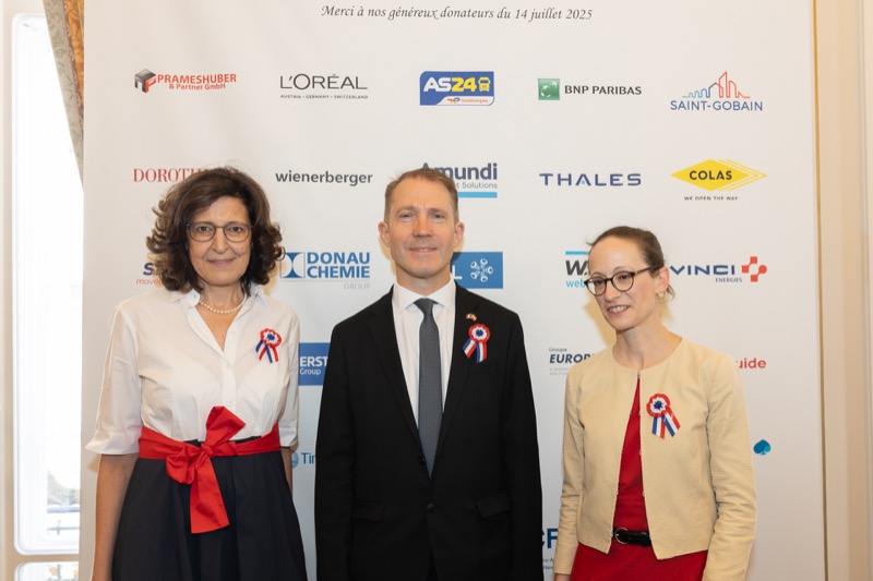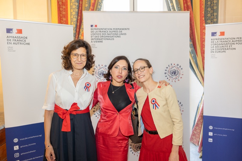 S.E. Matthieu Peyraud, Botschafter von Frankreich in Österreich, I.E. Delphine Hournau-Pouëzat, ständige Vertreterin Frankreichs bei den Internationalen Organisationen und I.E. Fatène Benhabylès-Foeth, ständige Vertreterin Frankreichs bei der OSZE, luden anlässlich des Nationalfeiertages zu einem Empfang in die prachtvolle Botschaft.