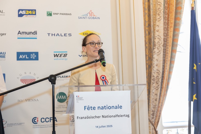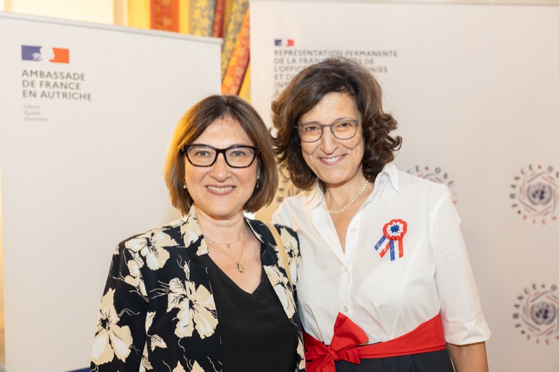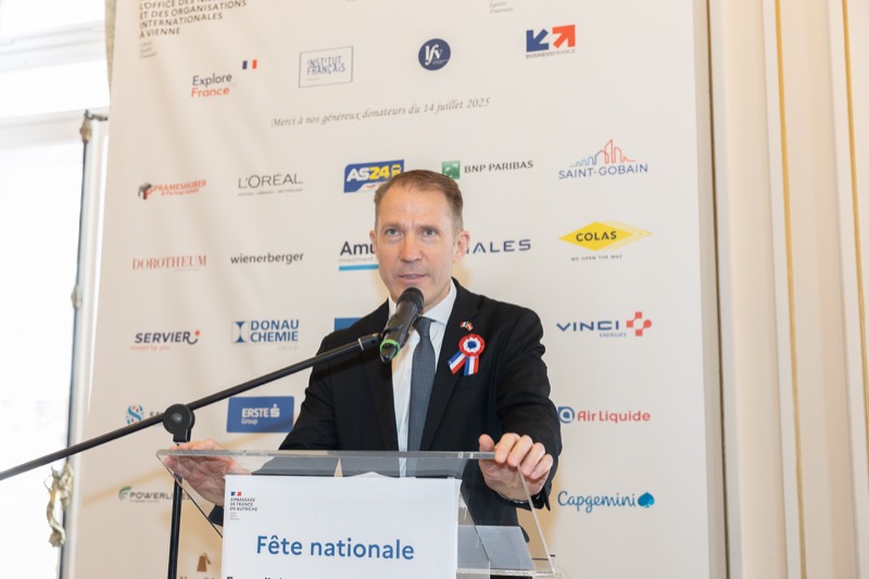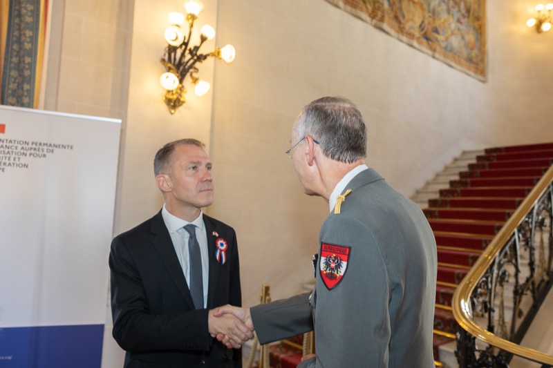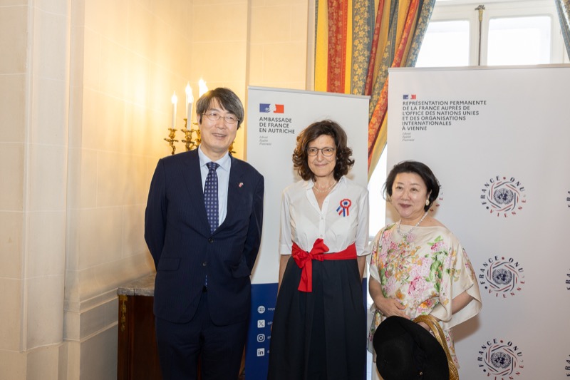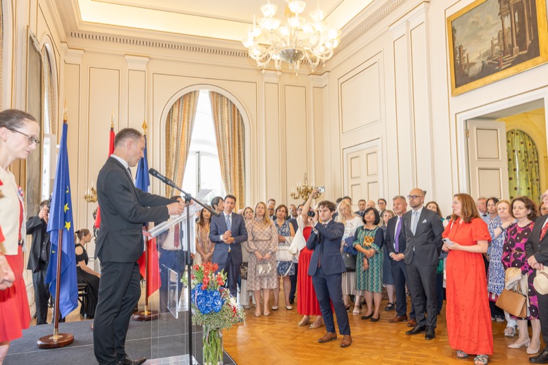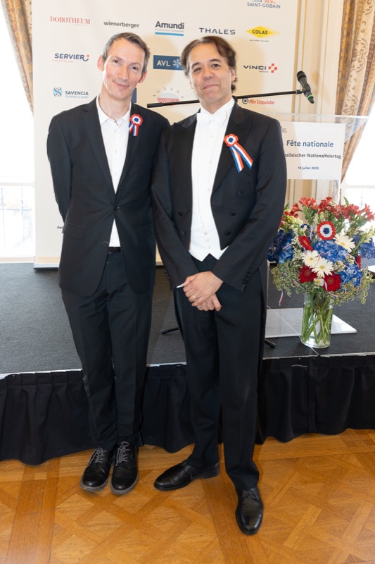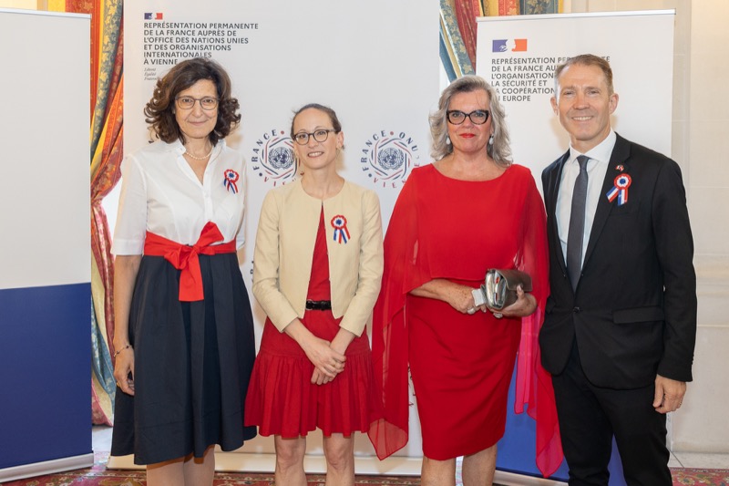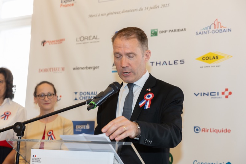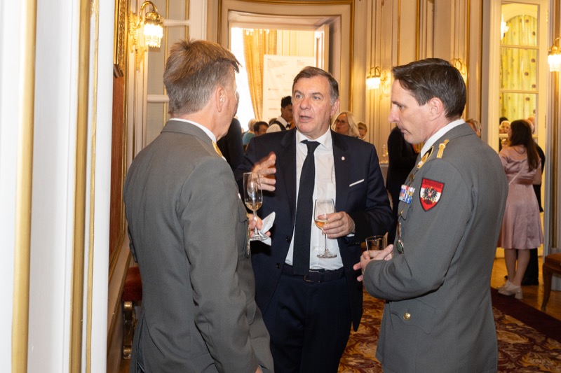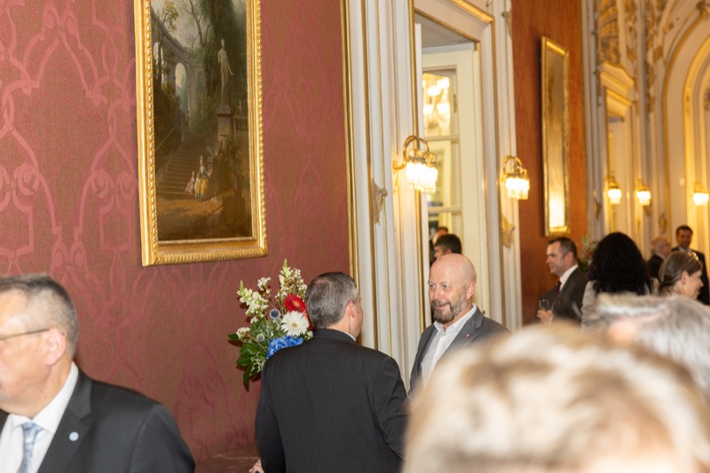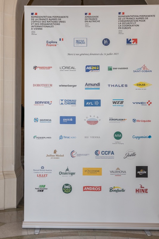 S.E. Matthieu Peyraud, Botschafter von Frankreich in Österreich, I.E. Delphine Hournau-Pouëzat, ständige Vertreterin Frankreichs bei den Internationalen Organisationen und I.E. Fatène Benhabylès-Foeth, ständige Vertreterin Frankreichs bei der OSZE, luden anlässlich des Nationalfeiertages zu einem Empfang in die prachtvolle Botschaft.