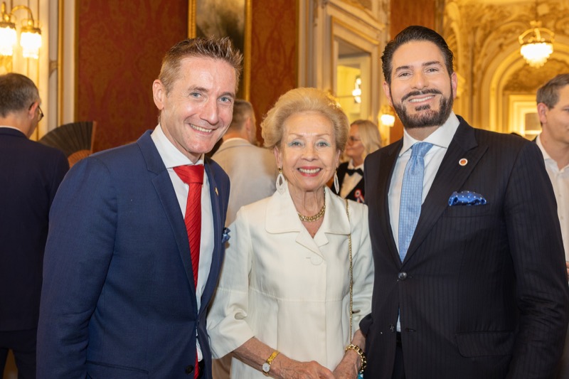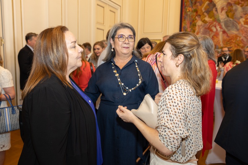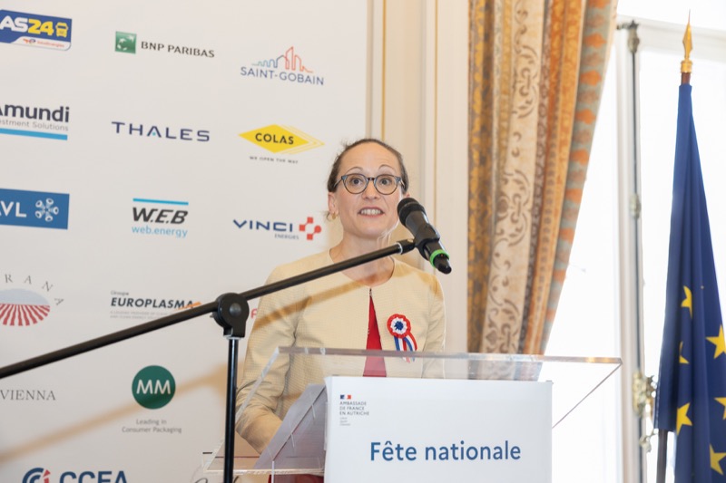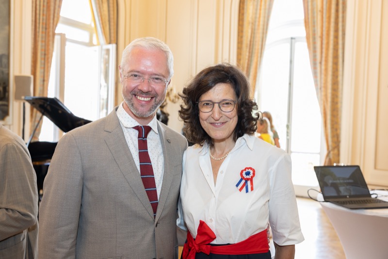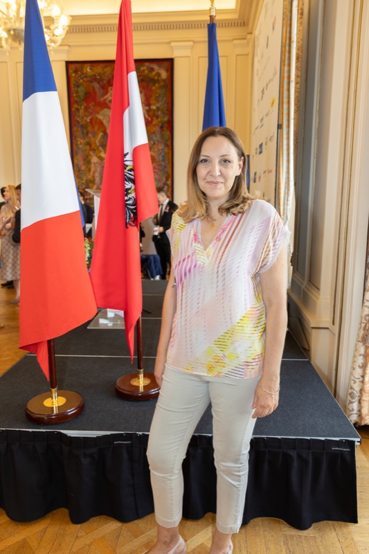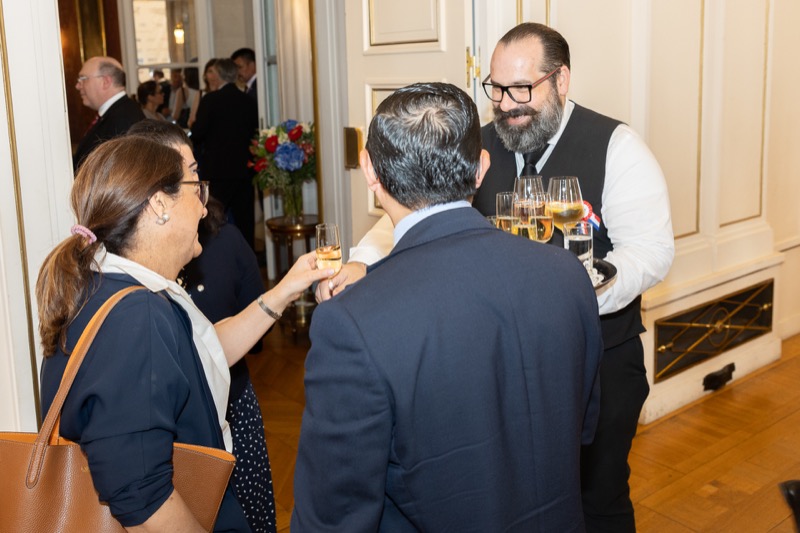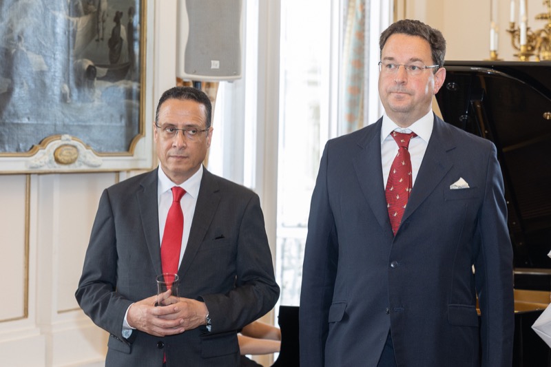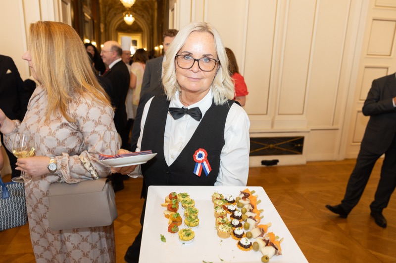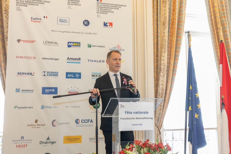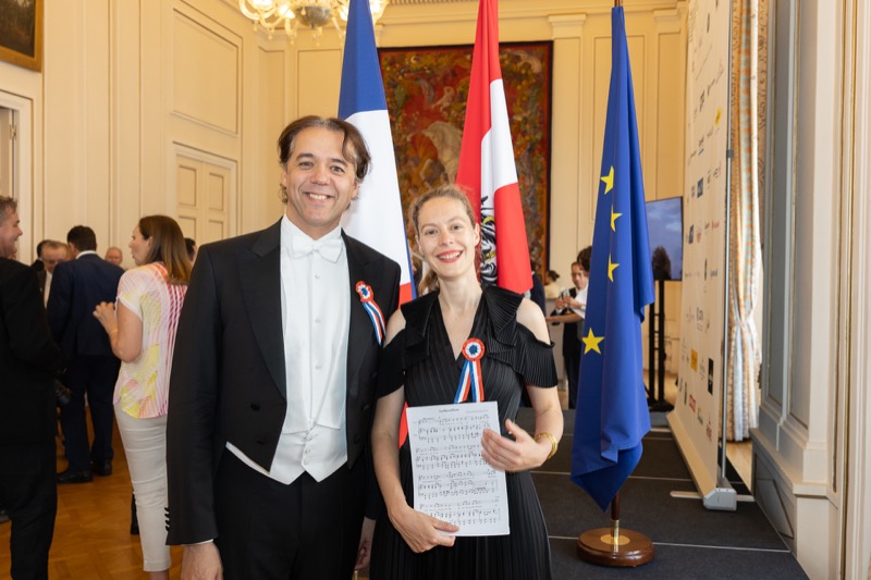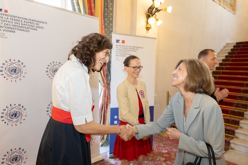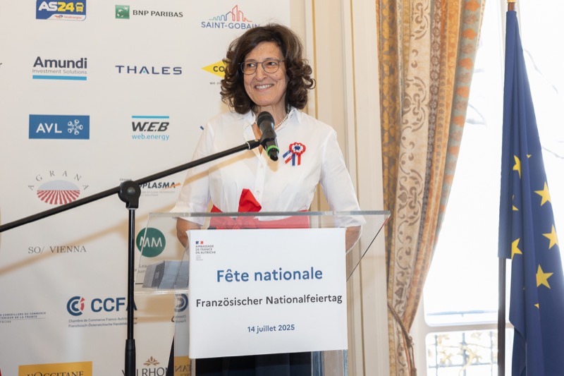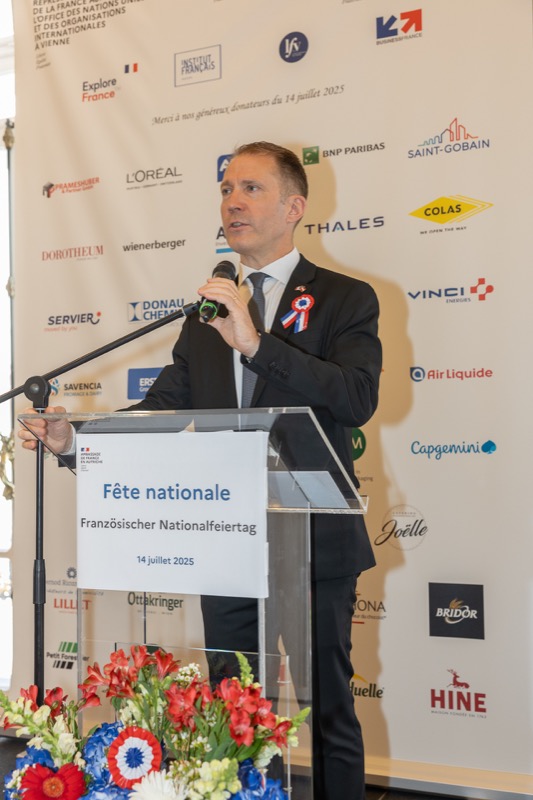 S.E. Matthieu Peyraud, Botschafter von Frankreich in Österreich, I.E. Delphine Hournau-Pouëzat, ständige Vertreterin Frankreichs bei den Internationalen Organisationen und I.E. Fatène Benhabylès-Foeth, ständige Vertreterin Frankreichs bei der OSZE, luden anlässlich des Nationalfeiertages zu einem Empfang in die prachtvolle Botschaft.