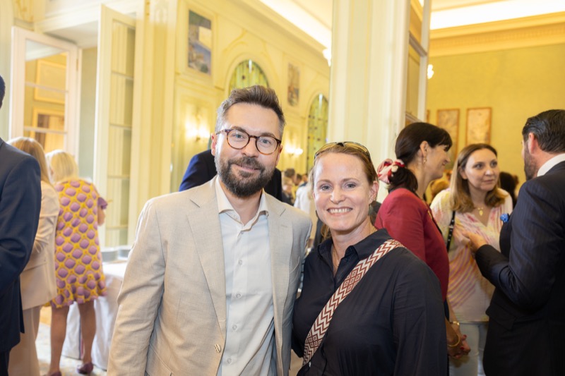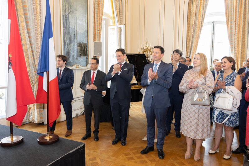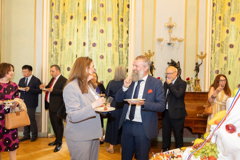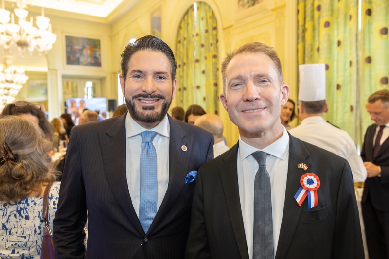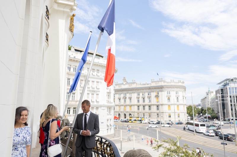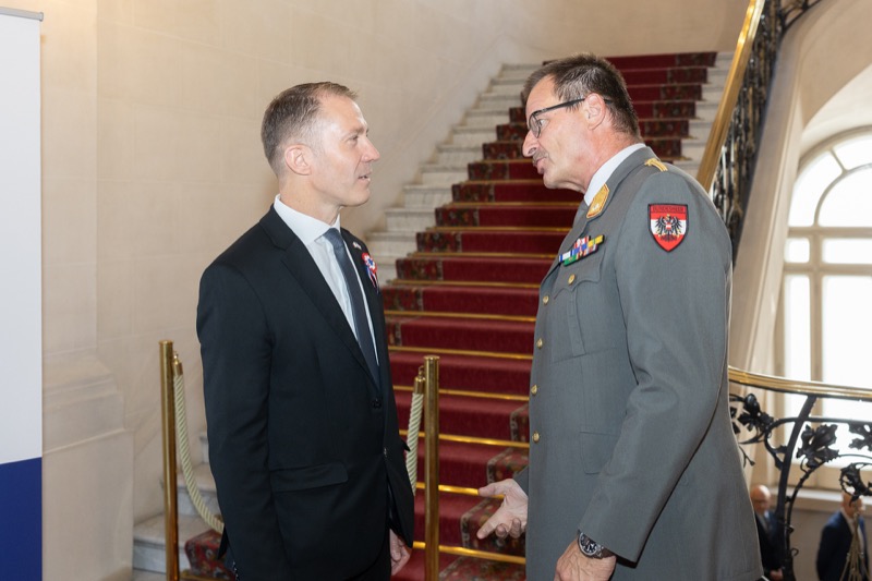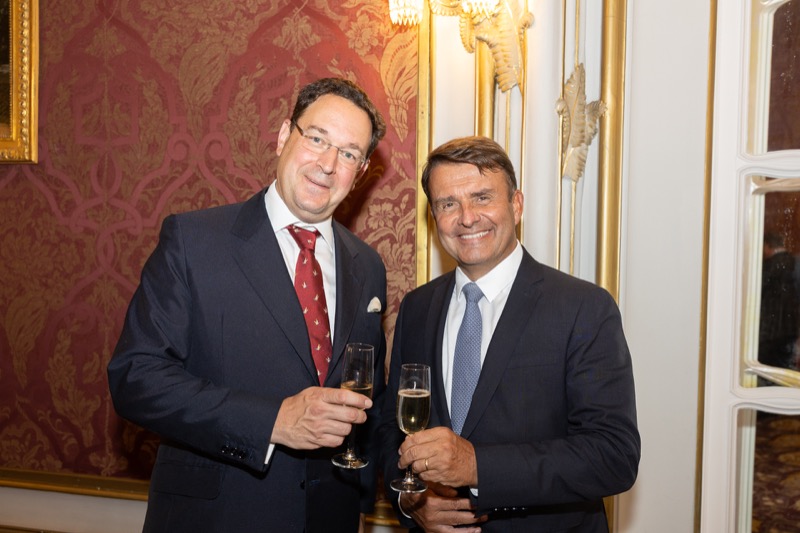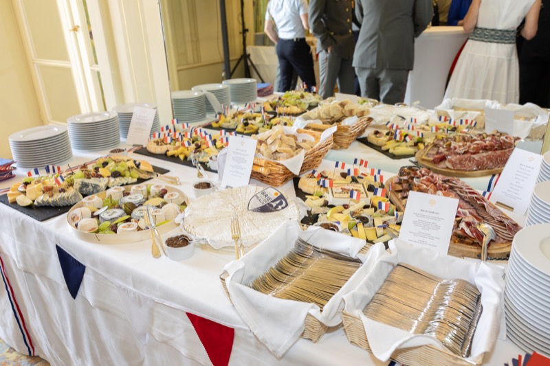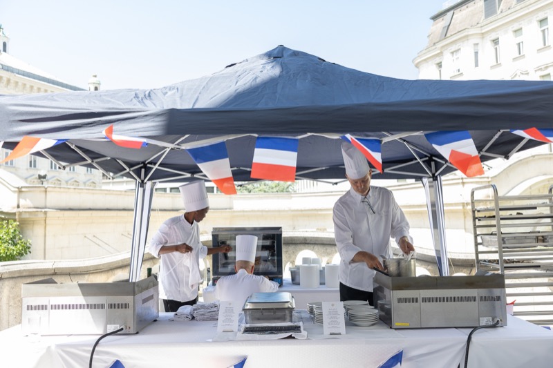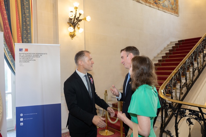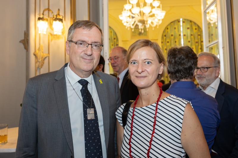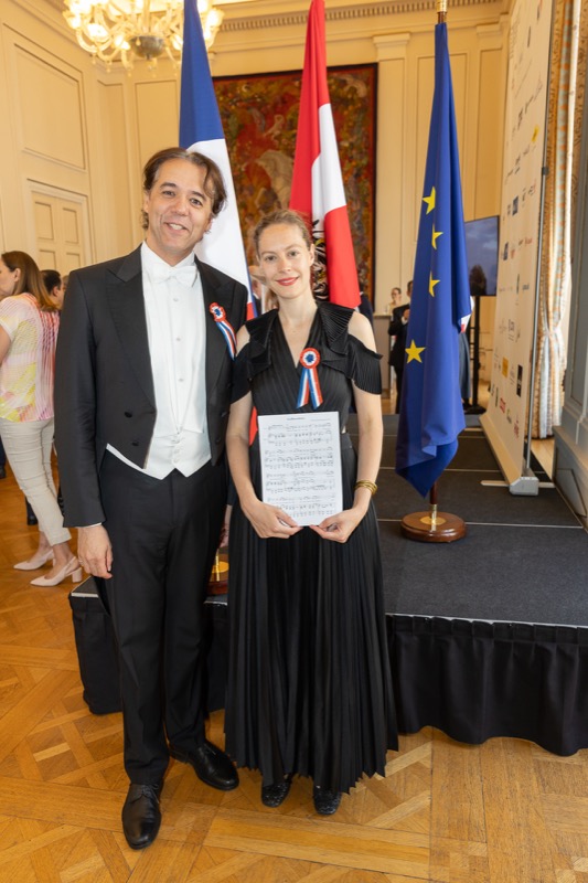 S.E. Matthieu Peyraud, Botschafter von Frankreich in Österreich, I.E. Delphine Hournau-Pouëzat, ständige Vertreterin Frankreichs bei den Internationalen Organisationen und I.E. Fatène Benhabylès-Foeth, ständige Vertreterin Frankreichs bei der OSZE, luden anlässlich des Nationalfeiertages zu einem Empfang in die prachtvolle Botschaft.