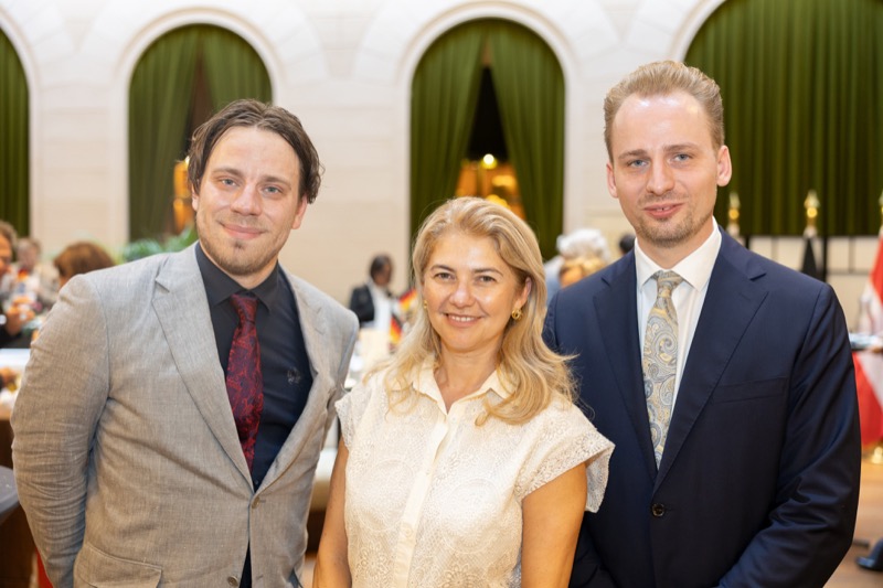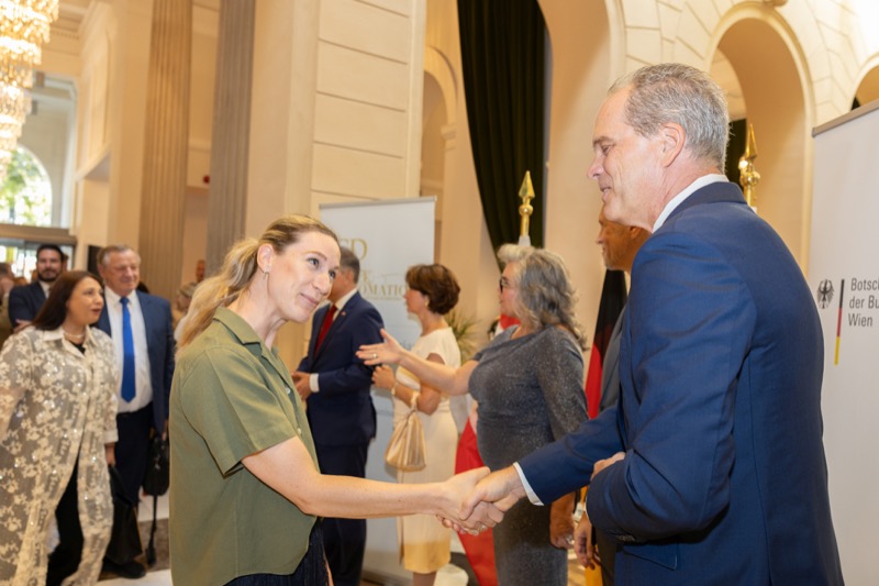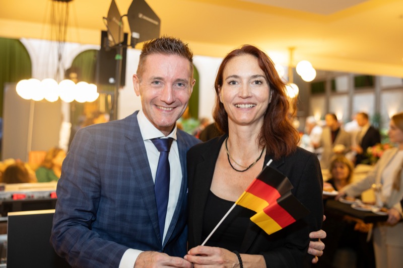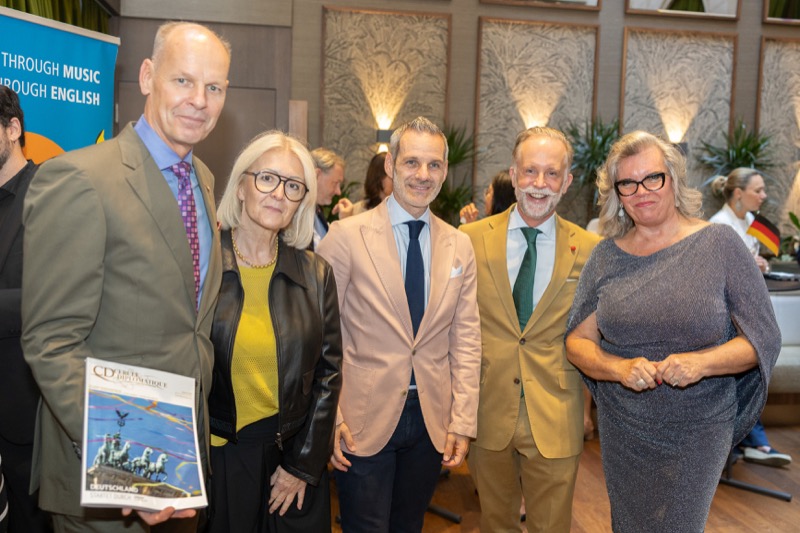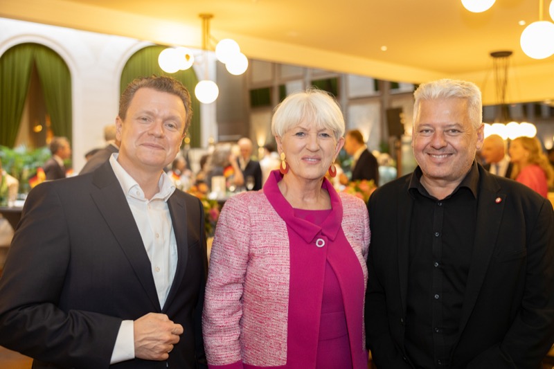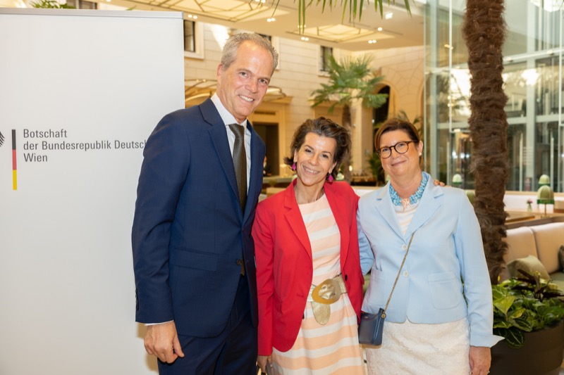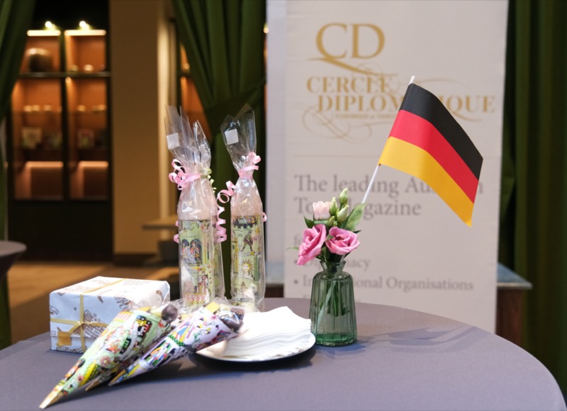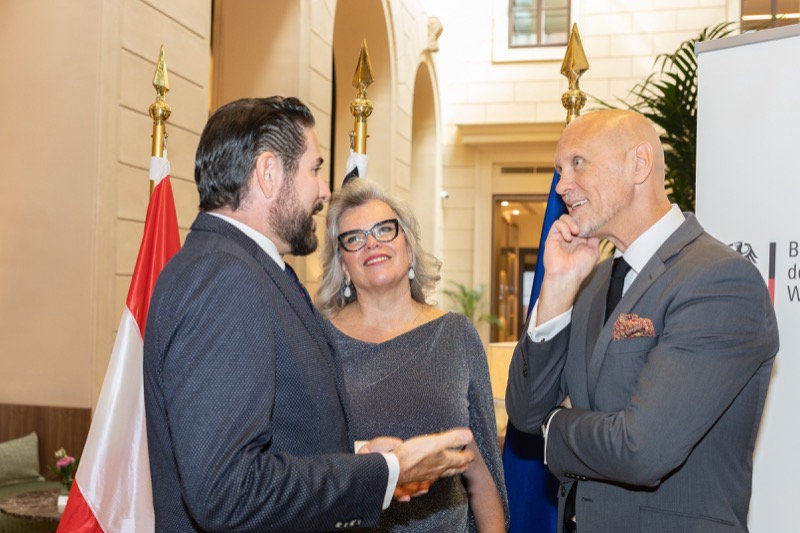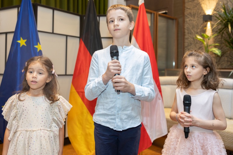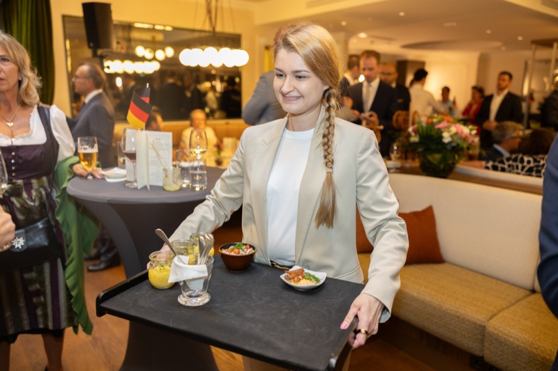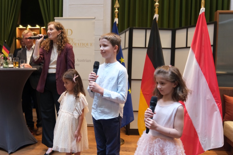 Nach den Ansprachen und der Überreichung von Delikatessenkörben aus dem Hause Schenkel sowie den berühmten handgefertigten Pralinen von Altmann&Kühne an Botschafter Cecere und seine Gattin Bettina Bundszus-Cecere, wurden die Gäste noch mit einer musikalischen Darbietung dreier Schüler:innen der Musical Munchkins, einer internationalen Musikschule in Wien, überrascht und sogar zum Mitsingen animiert. Danach wurde noch bis in den späten Nachmittag hinein bei deutschen Spezialitäten wie Käsespätzle, Krustenbraten oder Bayerischer Creme im Glas und kühlen Drinks gefeiert.