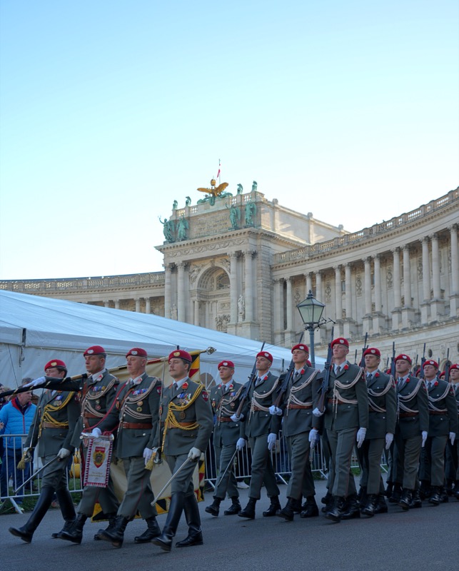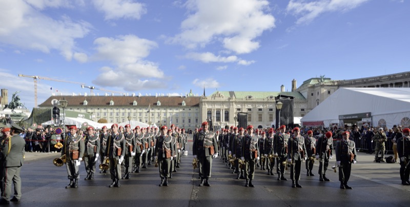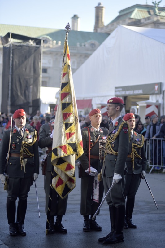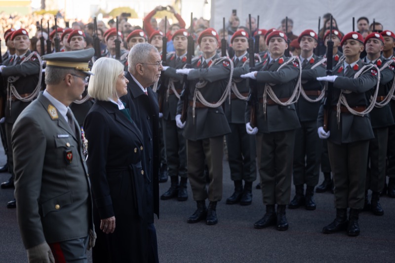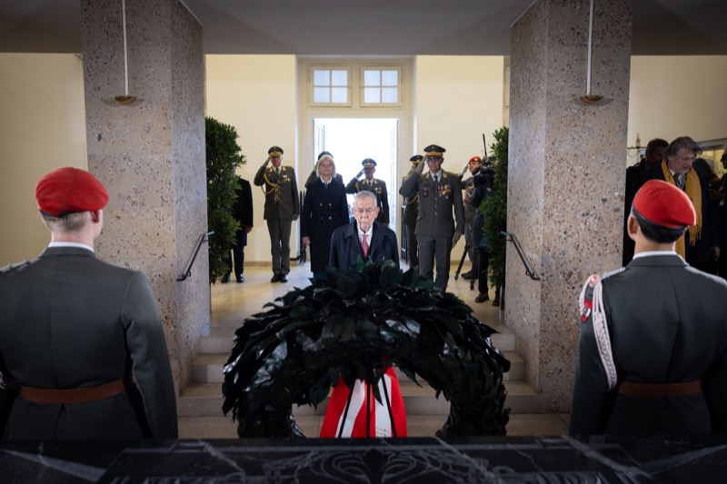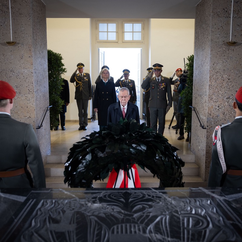 Traditionell begann der Nationalfeiertag am Wiener Heldenplatz mit den Kranzniederlegungen im Weiheraum des Äußeren Burgtores.