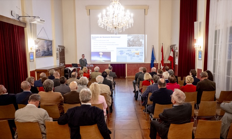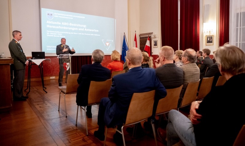 Am 23. Oktober 2025 lud der Dachverband aller österreichisch-ausländischen Gesellschaften – PaN und die Direktion 1 / Kommando der Landstreitkräfte & Spezialeinsätze des Österreichischen Bundesheeres zum Vortrag von Oberst des Generalstabdienstes Mag. Gernot Wurzer über „Aktuelle ABC-Bedrohung an ausgewählten Konfliktbeispielen. Herausforderungen und Antworten“ in den Festsaal des Standortkasinos der Maria-Theresien-Kaserne ein.