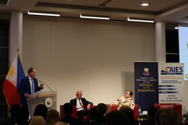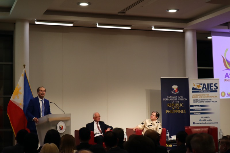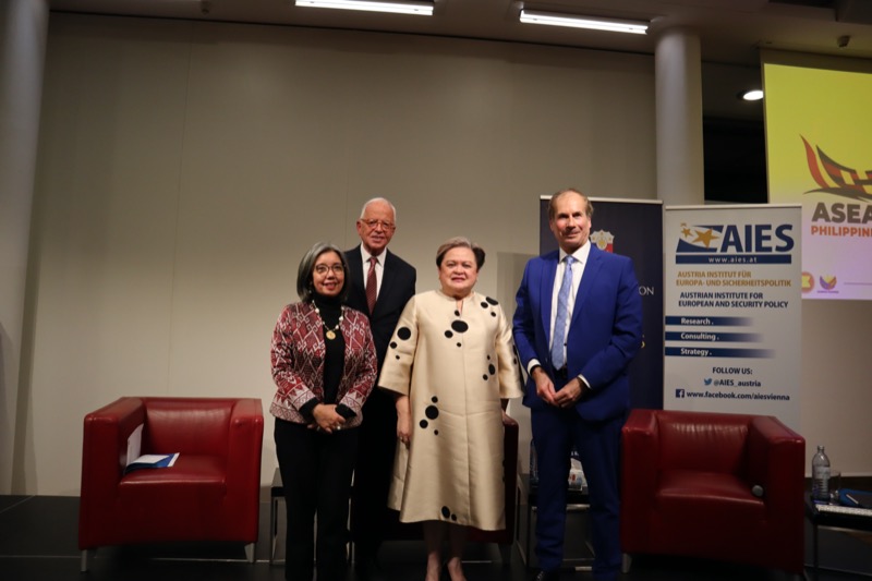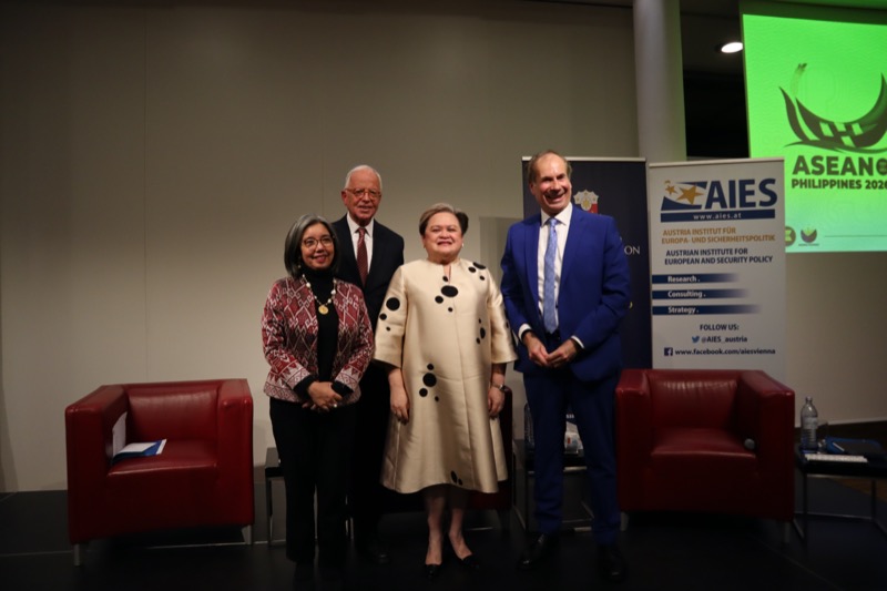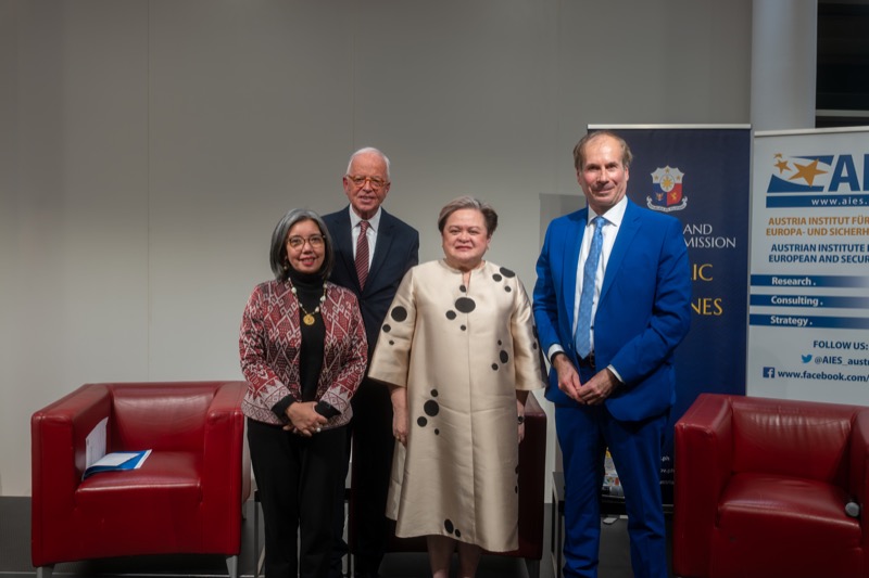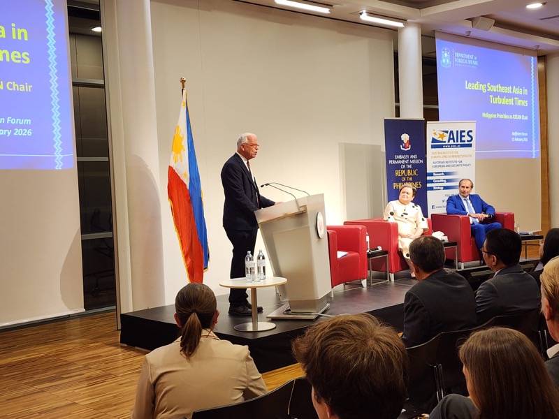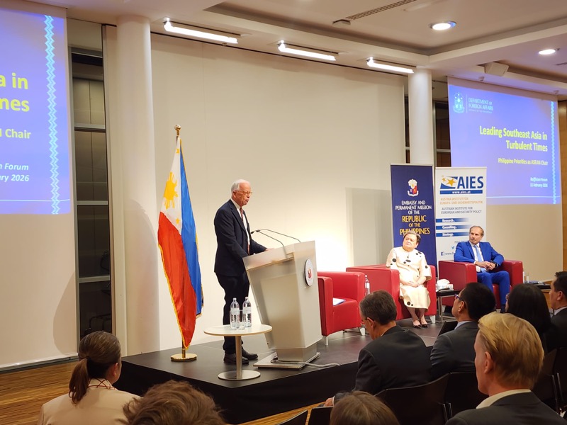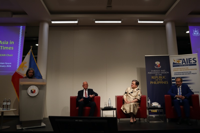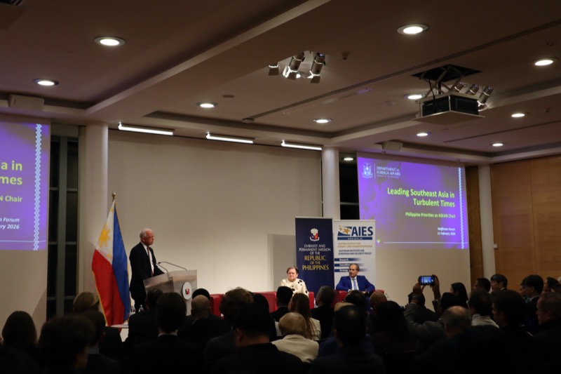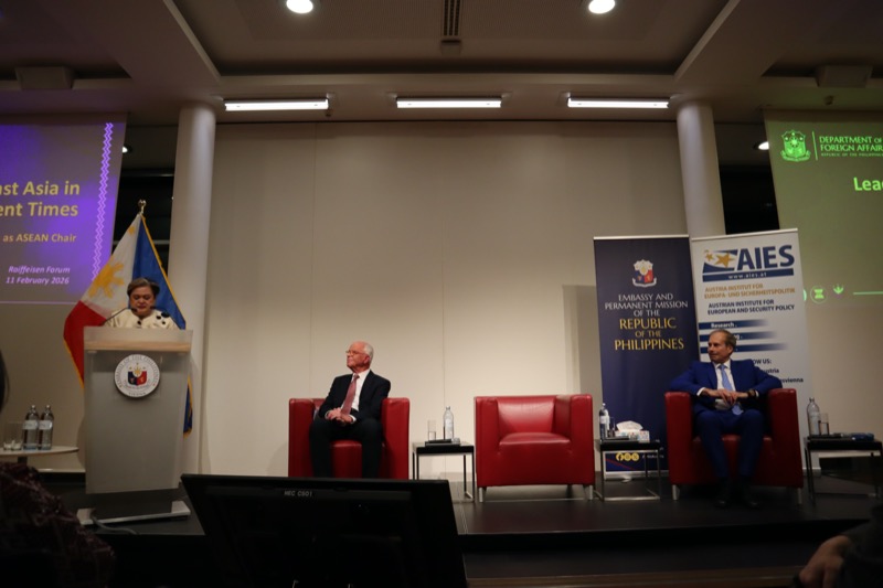 Die Außenministerin der Philippinen, I.E. Ma. Theresa P. Lazaro, sprach vor über 110 Teilnehmern aus dem diplomatischen Corps in Wien, Wissenschaftlern, Studenten, Medienvertretern und der philippinischen Gemeinschaft bei einem Vortrag über den Vorsitz der Philippinen in der ASEAN 2026, der im Raiffeisen Forum in Wien stattfand. Veranstaltet wurde der Abend von der Philippinischen Botschaft und Ständigen Vertretung in Wien in Zusammenarbeit mit dem Österreichischen Institut für Europäische und Sicherheitspolitik (AIES). Moderiert wurde von Dr. Werner Fasslabend, Präsident der AIES und ehemaliger österreichischer Verteidigungsminister.