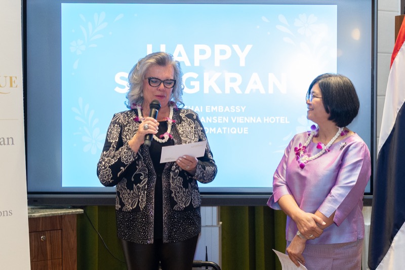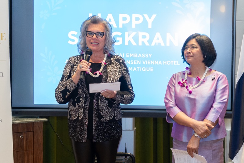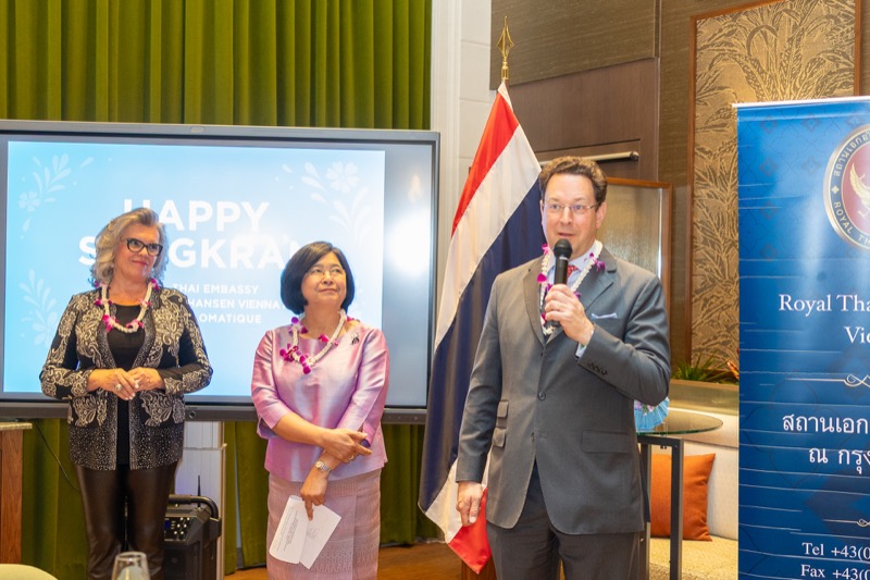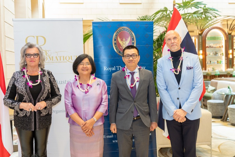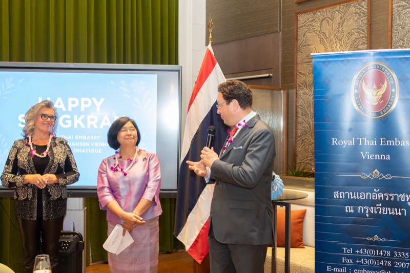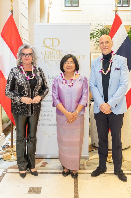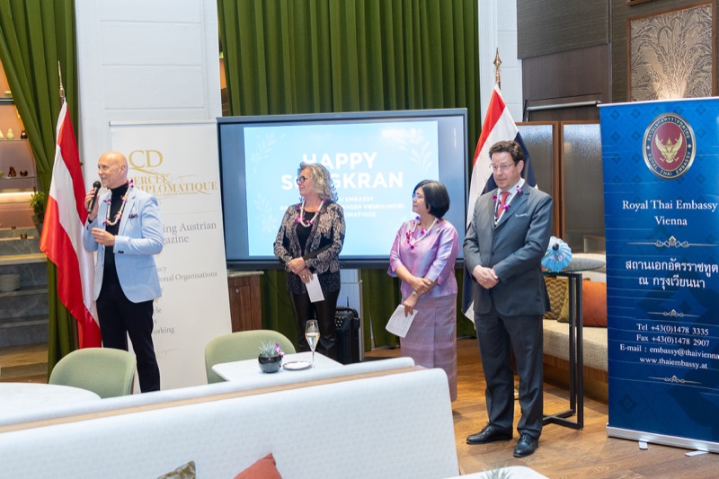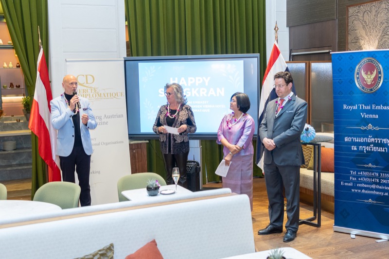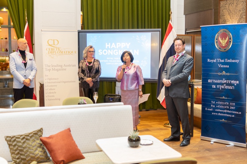 I.E. Pattarat Hongtong, Botschafterin des Königreichs Thailand in Österreich und ständige Vertreterin von Thailand bei den Vereinten Nationen und anderen Internationalen Organisationen in Wien, Andrea Fürnweger, Herausgeberin von CERCLE DIPLOMATIQUE, und Jürgen Ammerstorfer, Generaldirektor des Anantara Palais Hansen Vienna, luden erstmals anlässlich von Songkran zu einem Mittagessen mit österreichischen und thailändischen Spezialitäten in das Anantara Palais Hansen Vienna.