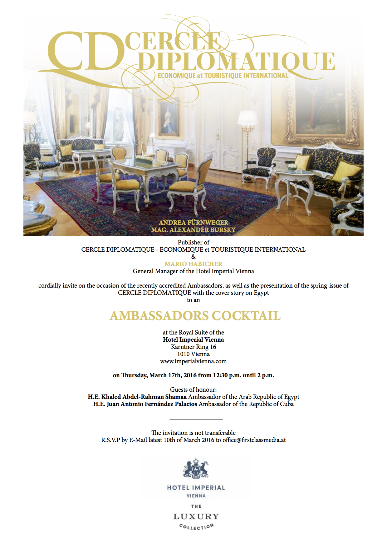 Die Präsentation der CD-Frühjahrsausgabe fand diesmal in einer ganz besonderen location statt, in der berühmten Fürsten-Suite des Hotel Imperial Wien, in der schon Persönlichkeiten wie Queen Elisabeth II, Bill Clinton, Walt Disney oder Michael Jackson genächtigt haben. Gemeinsam mit Mario Habicher, Generaldirektor des Hotels Imperial Wien, konnten wir rund 100 Gäste aus Diplomatie und Wirtschaft begrüssen, für das musikalische Rahmenprogramm sorgten die talentierten Schüler unsers Partners, der Amadeus International School.