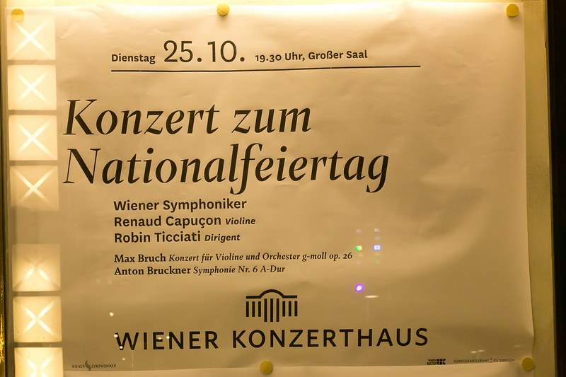 Anlässlich des österreichischen Nationalfeiertages luden Cercle Diplomatique und Johannes Neubert, Direktor der Wiener Symphoniker, sowie Matthias Naske, Intendant des Wiener Konzerthauses, zu einem Konzert der weltbekannten Wiener Symphoniker mit dem Dirigenten Robin Ticciati in das Konzerthaus. Die eingeladenen Botschafter genossen den Abend mit dem "1. Violinkonzert in g-Moll, op. 26" des Komponisten Max Bruch, an der Violine Renaud Capucon, sowie mit Anton Bruckners "6. Symphonie".
