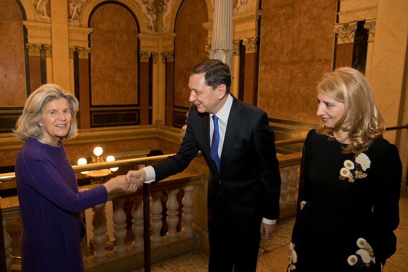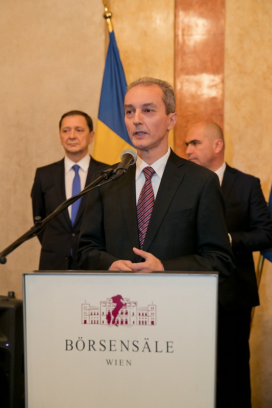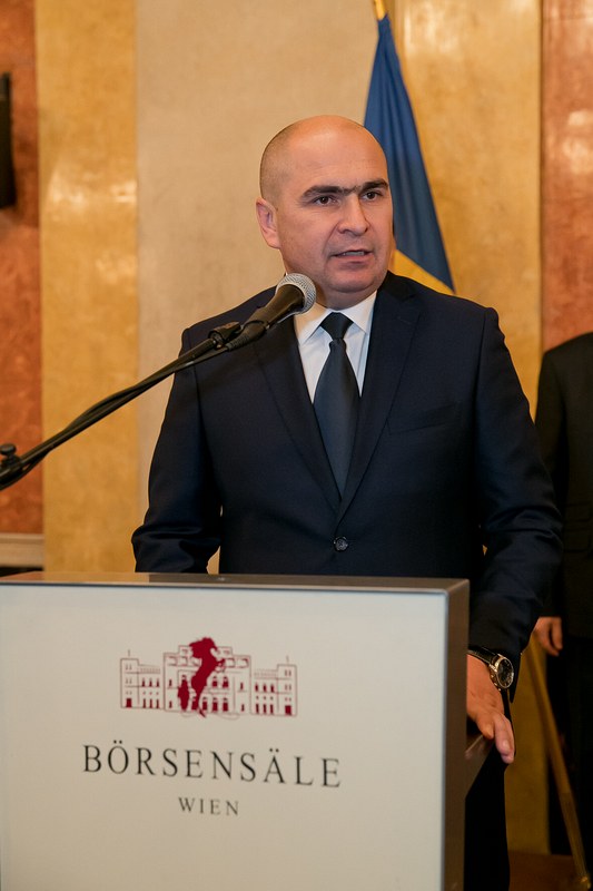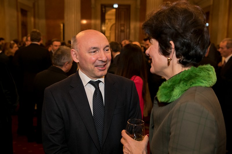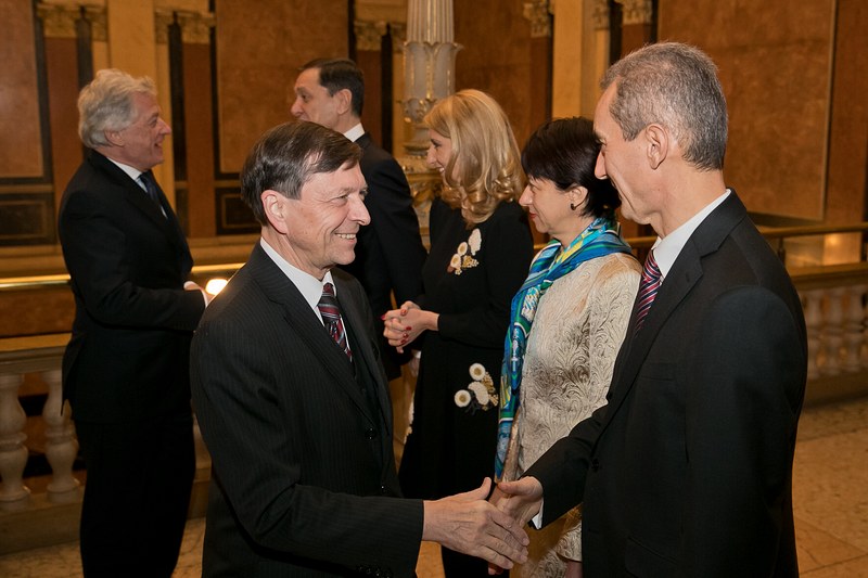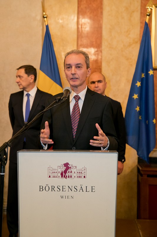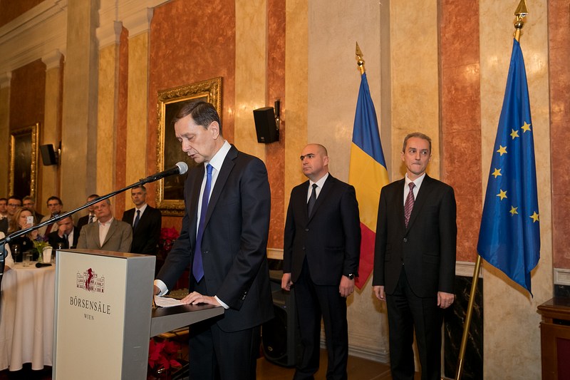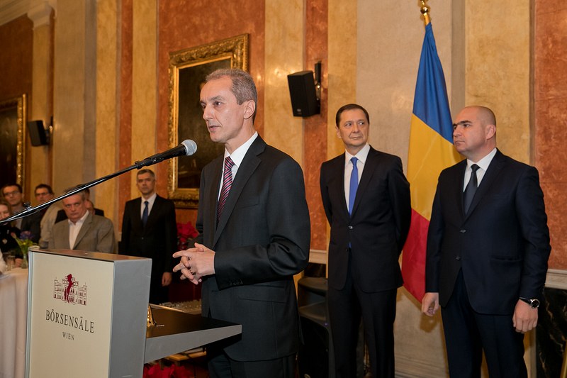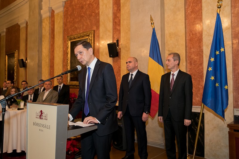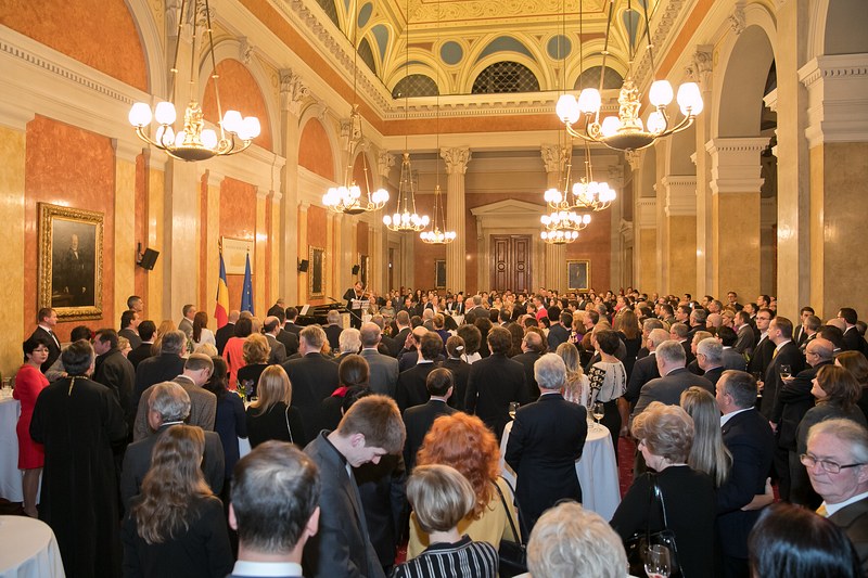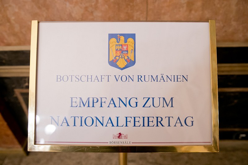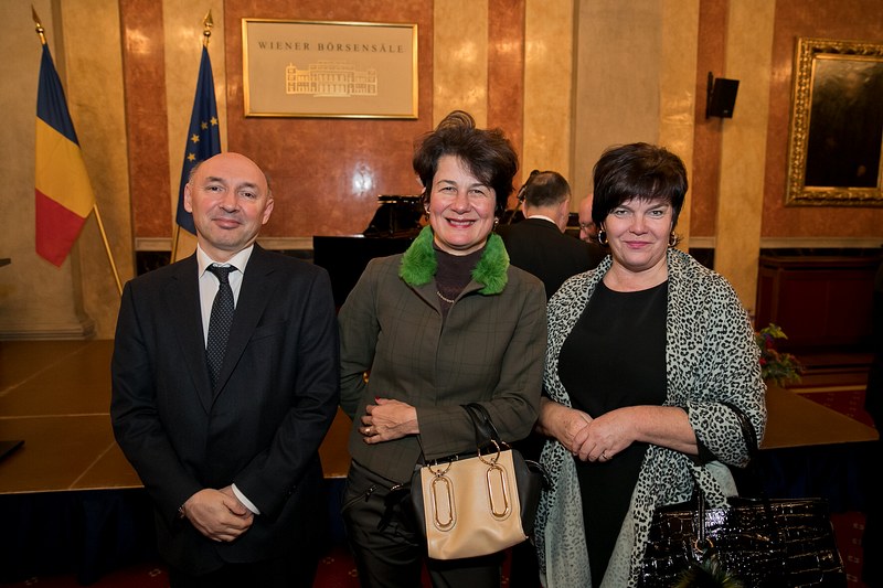 Der Botschafter von Rumänien in Österreich, S.E. Bogdan Mazuru, und Frau Emilia Mazuru sowie der ständige Vertreter von Rumänien bei der OSZE und den VN, S.E. Cristian Istrate, und Frau Gabriela Carmen Istrate, luden in Partnerschaft mit der Stadt Oradea zu einem Empfang anlässlich des Nationalfeiertages in die Wiener Börsensäle.