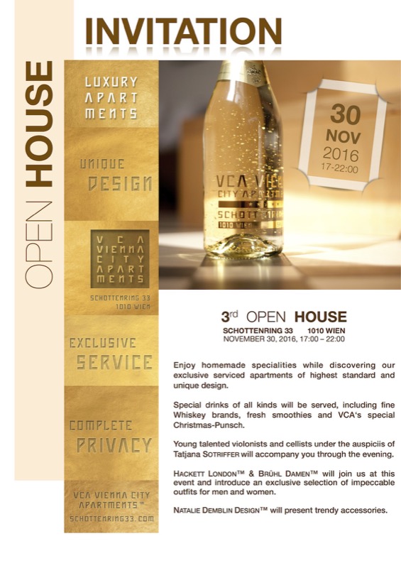 Alfred und Barbara Krammer, die Gründer der VCA Vienna City Apartments, luden gemeinsam mit CD zu einem "open house". Das gemütliche Beisammensein mit kulinarischen Köstlichkeiten konnten die Gäste auch nutzen, um die exklusiven und hochmodernen "serviced city apartments" am Schottenring 33 zu besichtigen. Bei musikalischer Untermalung gab es ausserdem eine Präsentation exklusiver Outfits von Hackett London & Brühl Damen.