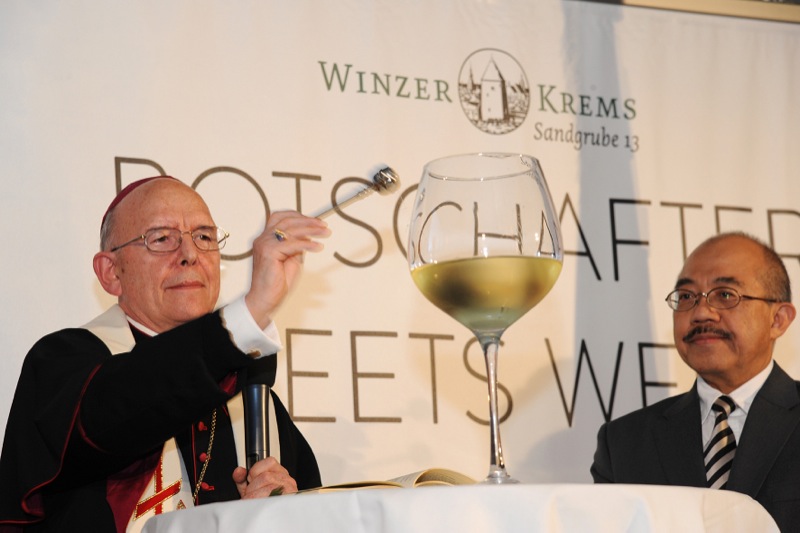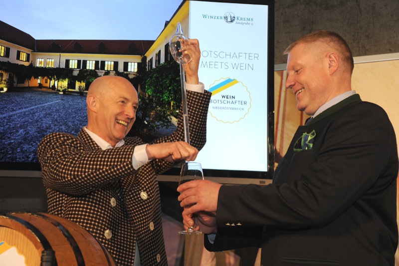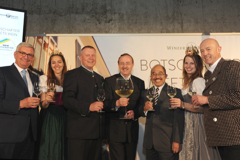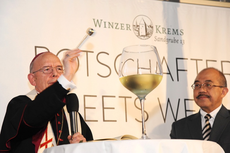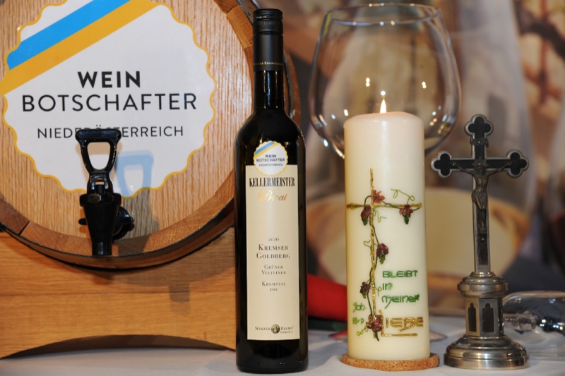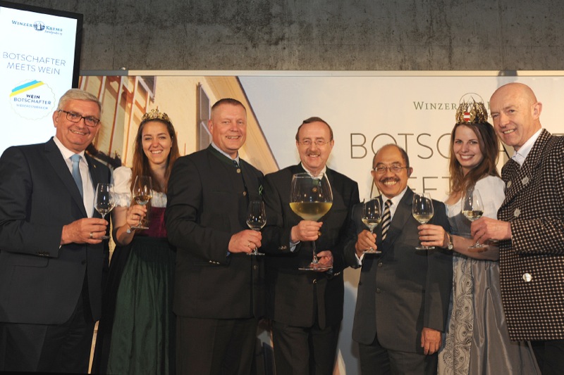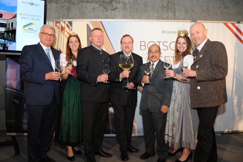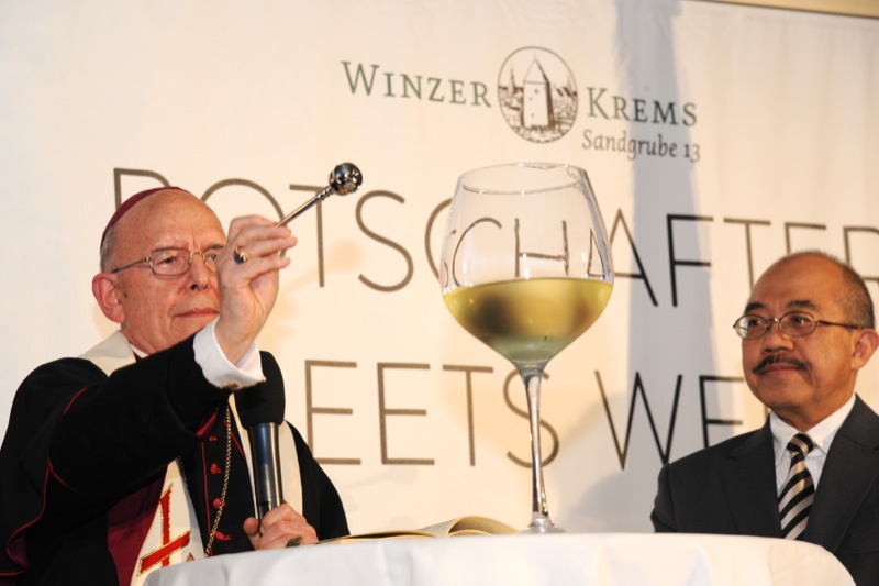 Der niederösterreichische Weinbotschafter Landespolizeidirektor Hofrat Dr. Franz Prucher und sein Weinpate Dir. Franz Ehrenleitner luden zur Veranstaltung "Botschafter meets Wein" nach Krems. Im Mittelpunkt stand die Weinsegnung des "Botschafterweins", ein Grüner Veltliner 2016 vom Kremser Goldberg, ein würdiger Botschafter für den Kremser Wein in die ganze Welt.