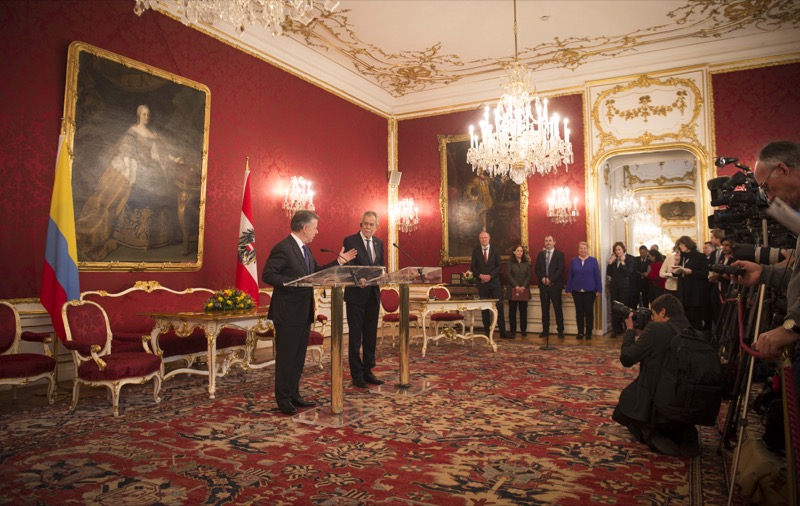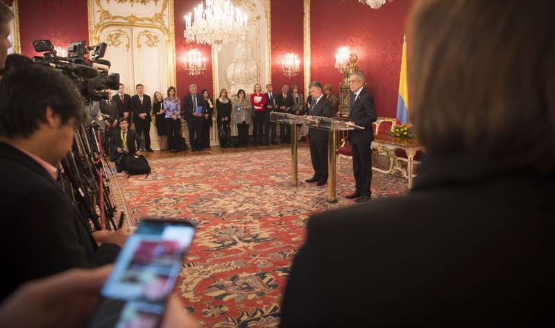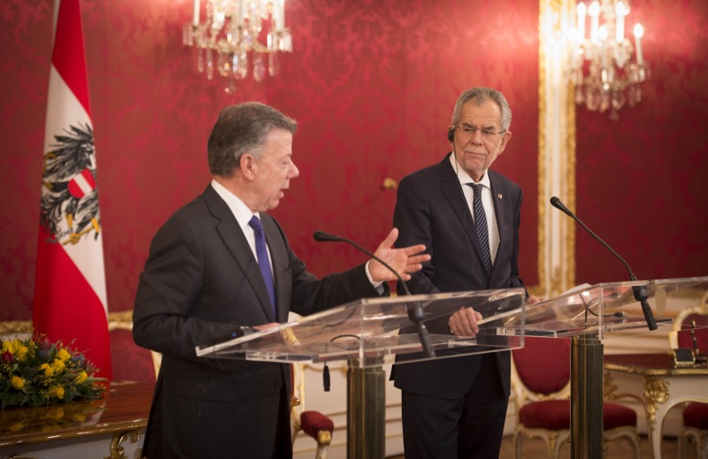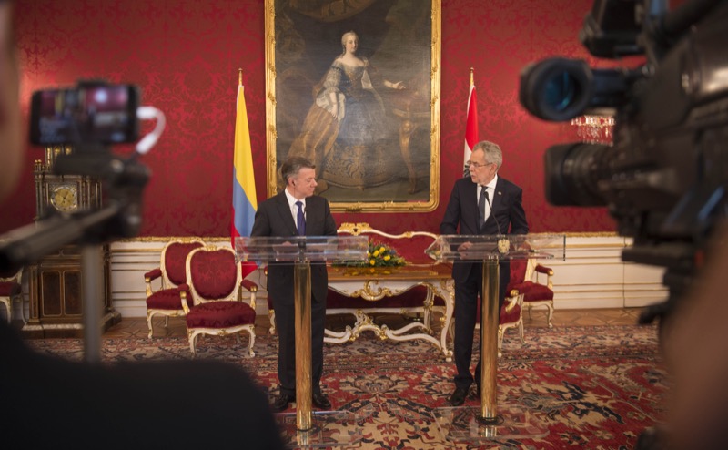 Der Friedensnobelpreisträger und Präsident der Republik Kolumbien, Juan Manuel Santos Calderón, war vergangenen Freitag auf offiziellem Besuch in Österreich. Im Rahmen des Besuchs in der Präsidentschaftskanzlei wurde ein Abkommen über eine Zusammenarbeit im Bereich der erneuerbaren Energien unterzeichnet, weiters waren beide Staatsoberhäupter einer Meinung, dass der fortschreitende Friedensprozess in Kolumbien dem lateinamerikanischen Land aber auch Partnern wie der EU oder Österreich neue Möglichkeiten der Kooperation, etwa im Wirtschaftsbereich, eröffnet.