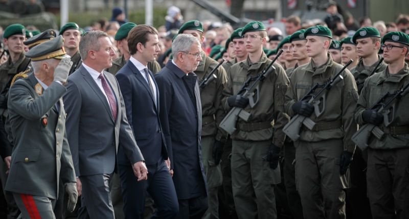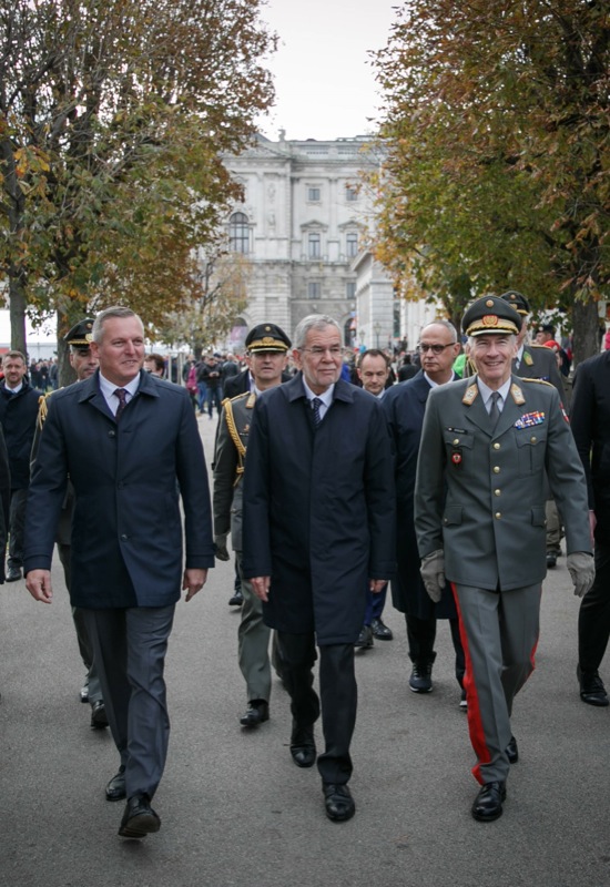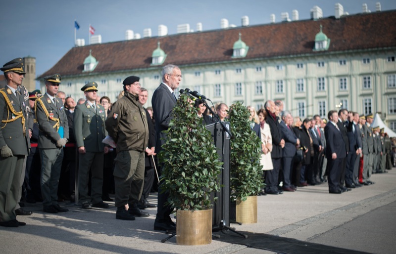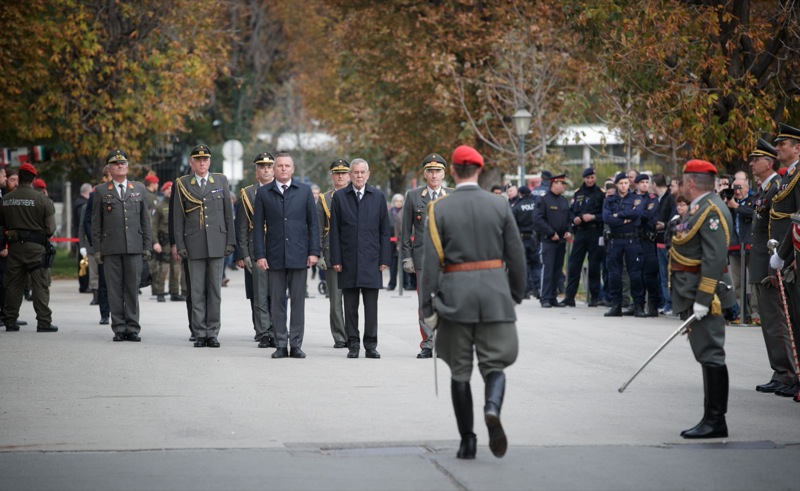 Österreich feierte am Freitag die "immerwährende Neutralität", die der Nationalrat am 26. Oktober 1955 beschlossen hat. Die offiziellen Feierlichkeiten begannen mit dem Abschreiten der Ehrenkompanie der Garde durch Oberbefehlshaber Van der Bellen, Verteidigungsminister Mario Kunasek und Generalstabschef Robert Brieger. Danach legten sie Kränze beim Denkmal für die Freiheitskämpfer sowie bei der Gedenktafel für verunglückte und gefallene Soldaten nieder.