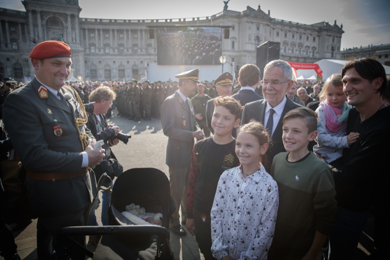 Der Nationalfeiertag begann am Freitagvormittag wie jedes Jahr mit den traditionellen Kranzniederlegungen. Bundespräsident Alexander Van der Bellen und die Bundesregierung gedachten am Äußeren Burgtor der toten Soldaten und Opfer des Widerstandes. Bei passablem Herbstwetter startete zugleich das umfangreiche Feiertagsprogramm rund um den Heldenplatz.