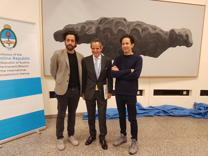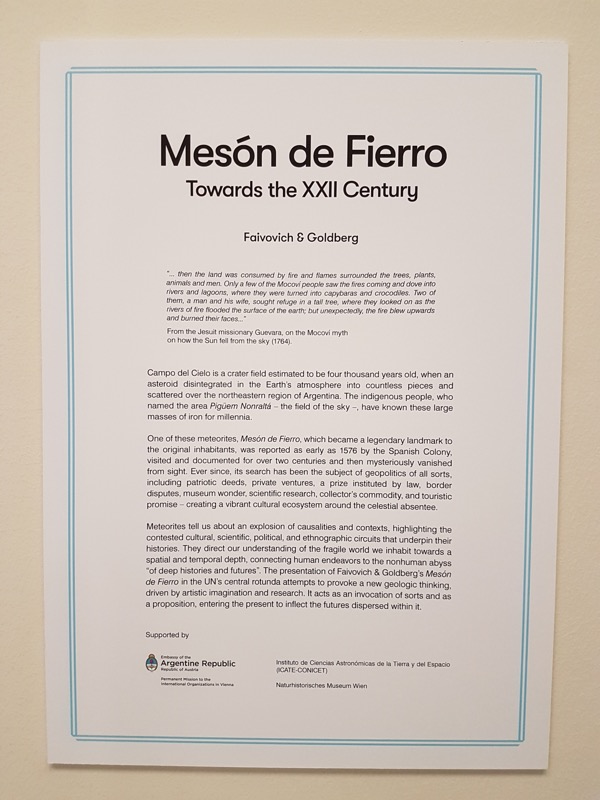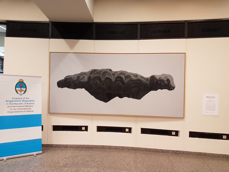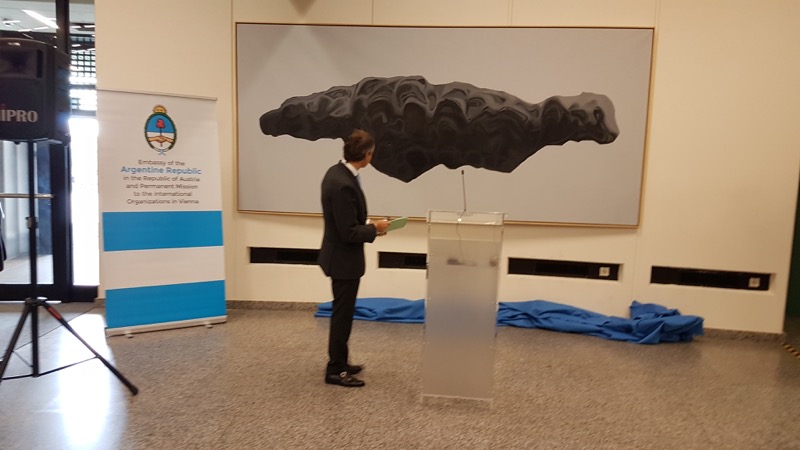 Das Gemälde "Mesón de Fierro" der argentinischen Künstler Guillermo Faivovich und Nicolás Goldberg wurde von Rafael Mariano Grossi, Botschafter der Republik Argentinien, Simonetta Di Pippo, Direktorin der UNOOSA und Christian Köberl, Direktor des Naturhistorischen Museums, im Hauptquartier der Vereinten Nationen in Wien feierlich enthüllt.
