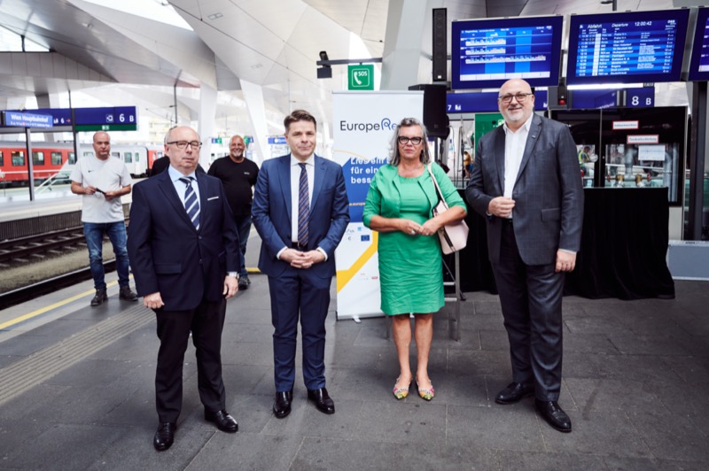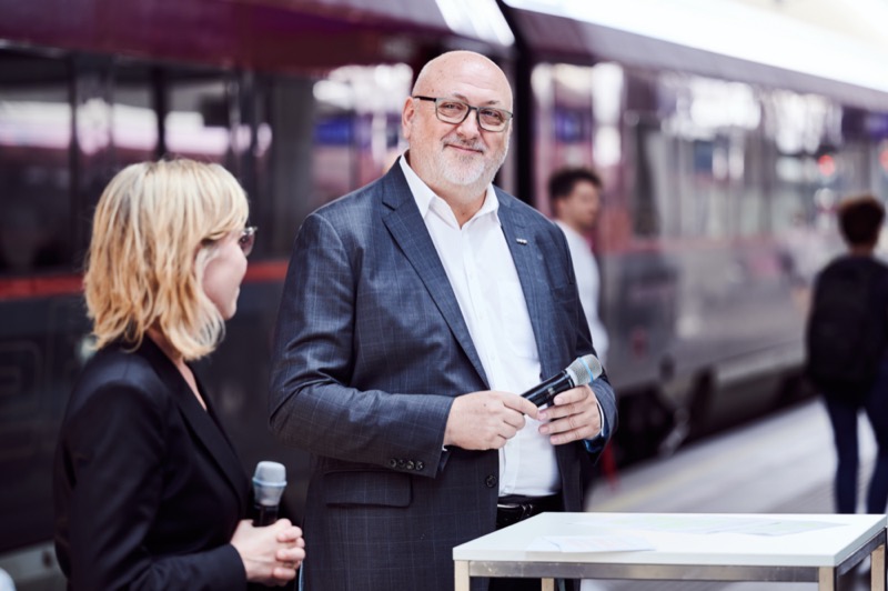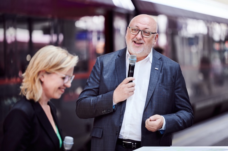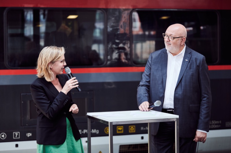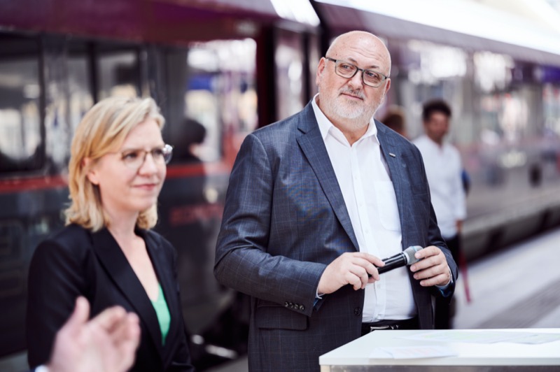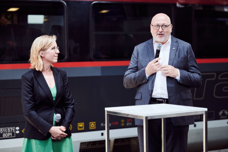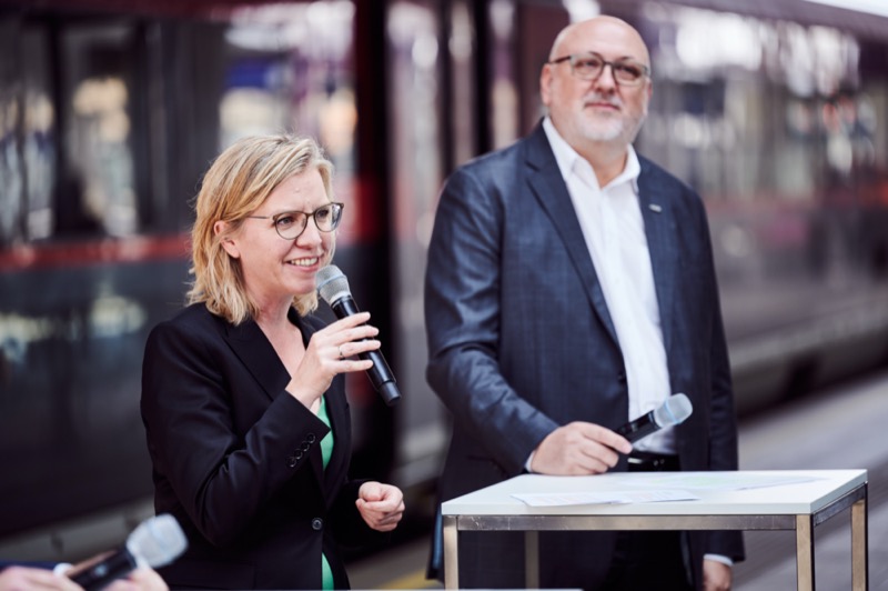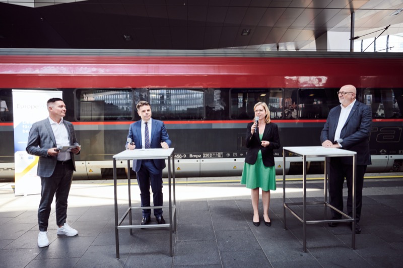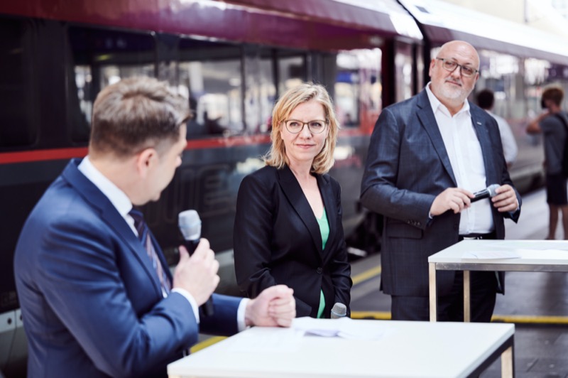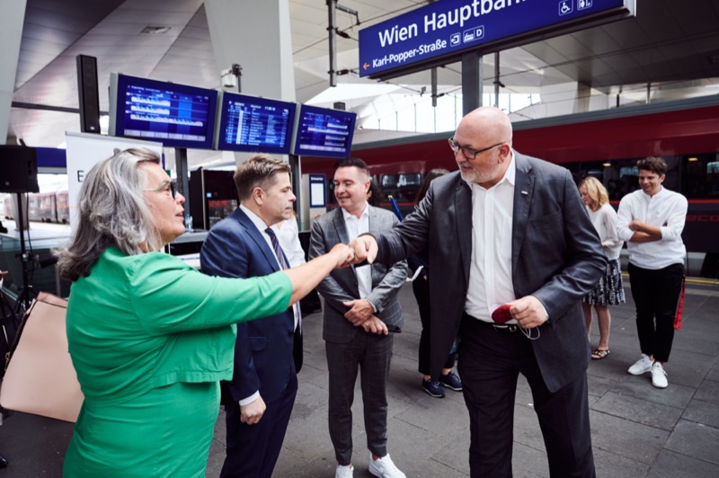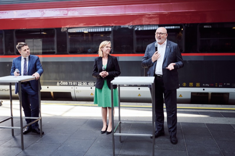 Beim heutigen Kick-off am Hauptbahnhof waren Bundesministerin Leonore Gewessler, S.E. Aleksander Gerzina, Botschafter der Republik Slowenien, und Andreas Matthä, Vorstandsvorsitzender der ÖBB Holding AG anwesend.