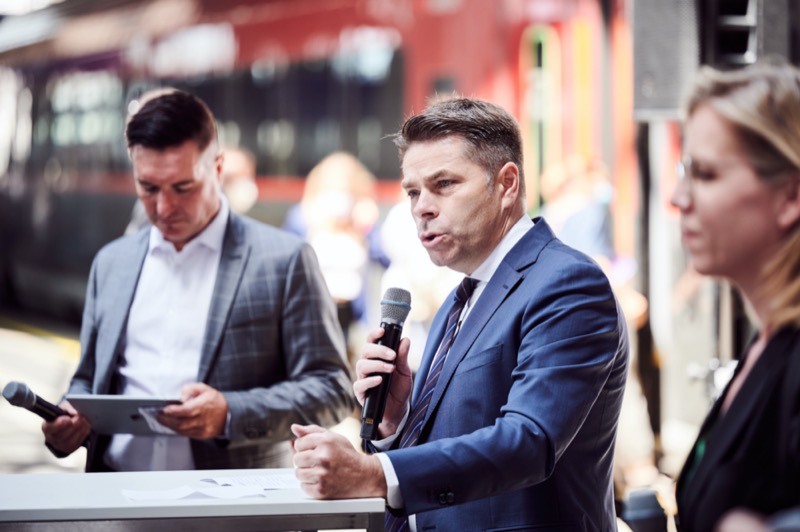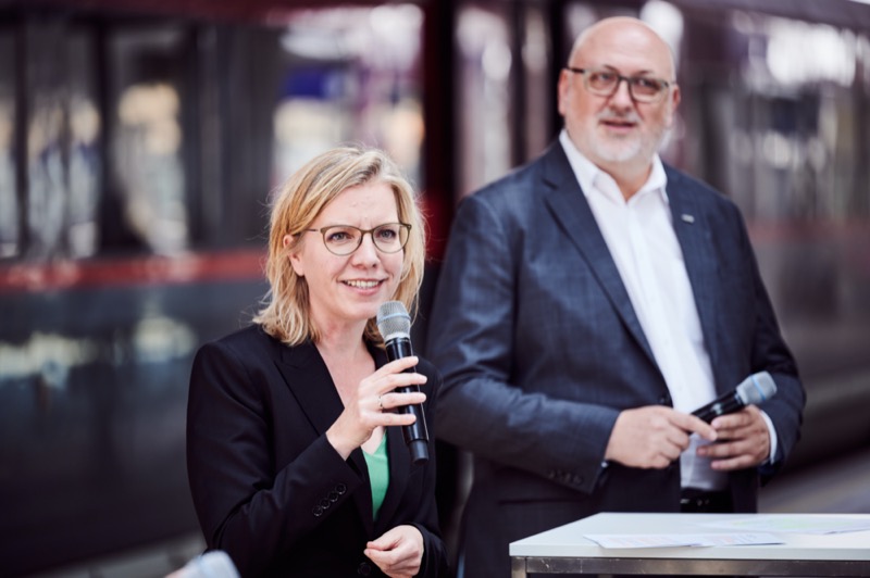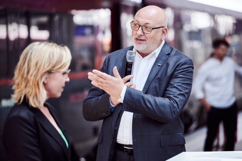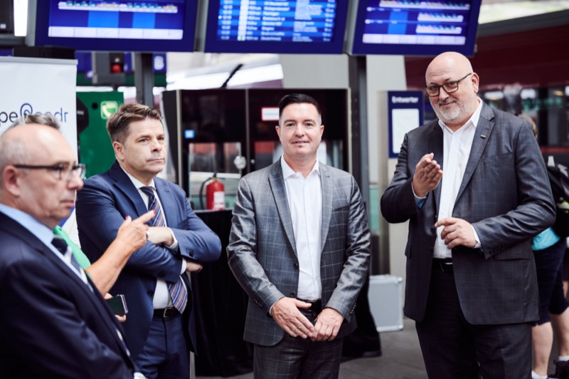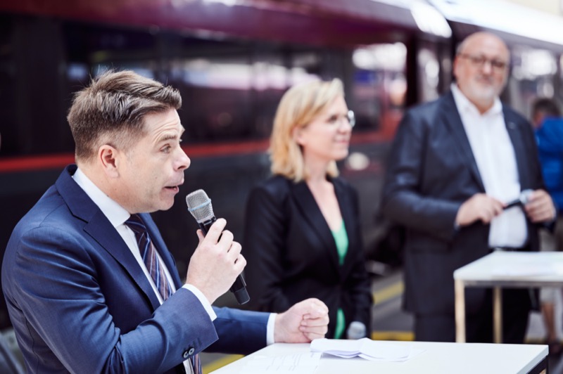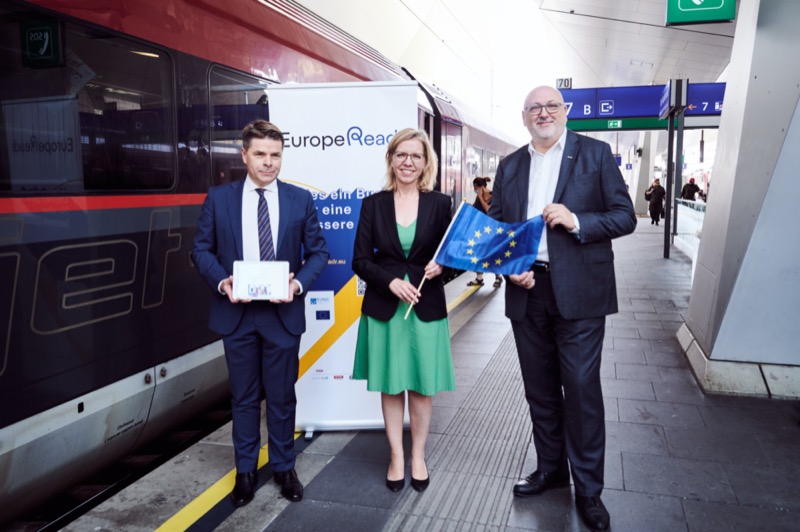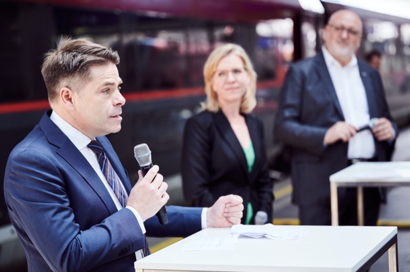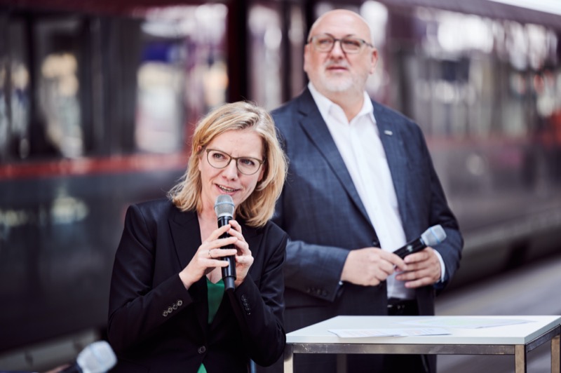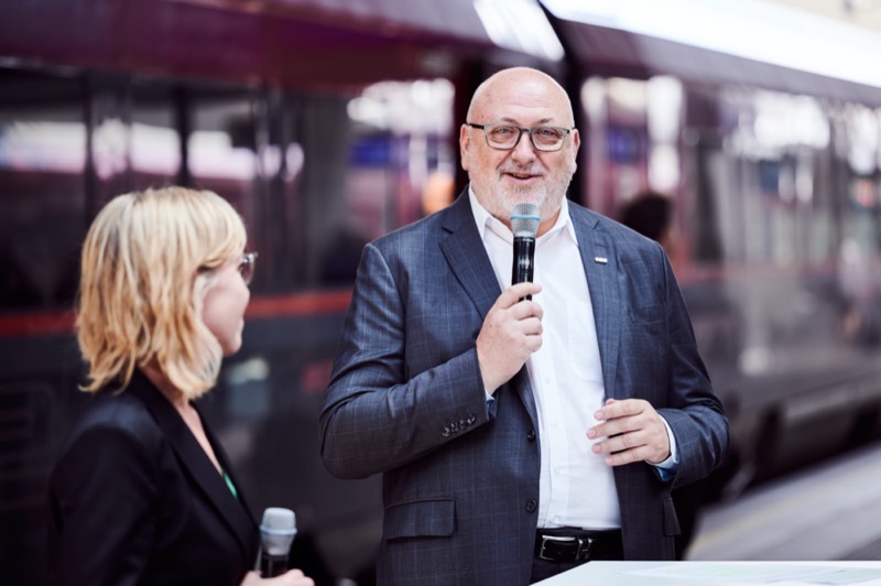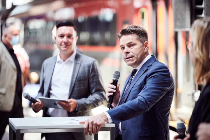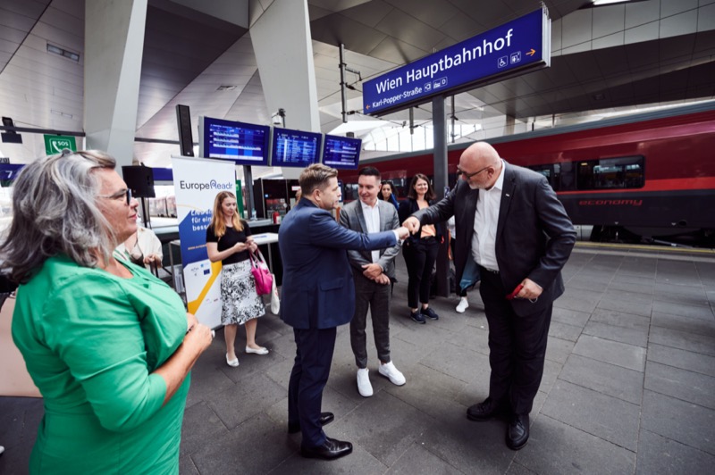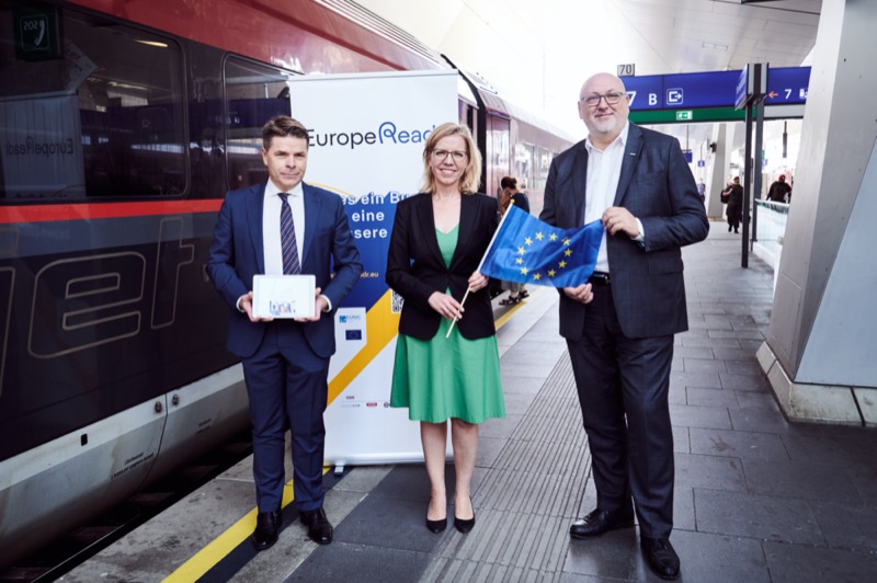 Beim heutigen Kick-off am Hauptbahnhof waren Bundesministerin Leonore Gewessler, S.E. Aleksander Gerzina, Botschafter der Republik Slowenien, und Andreas Matthä, Vorstandsvorsitzender der ÖBB Holding AG anwesend.