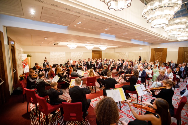 Prima la musica-Wien und die Wiener Philharmoniker präsentierten mit der Camerata prima la musica-Wien ein Programm mit Werken von W.A. Mozart, Louis Spohr und Antonín Dvořák sowie die Uraufführung „Kairos im Kronos 1756/1956“ des österreichischen Komponisten Herbert Willi, der den Abend mit seiner Anwesenheit beehrte. Die Camerata prima la musica-Wien im Rahmen des Talenteförderprogramms von Mag. Angelika Persterer-Ornig, der Geschäftsleitung von prima la musica-Wien, stellt eine Auswahl der begabtesten jungen NachwuchsstreicherInnen Österreichs dar und wurde vom Wiener Philharmoniker Harald Krumpöck dirigiert.
