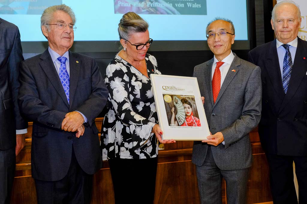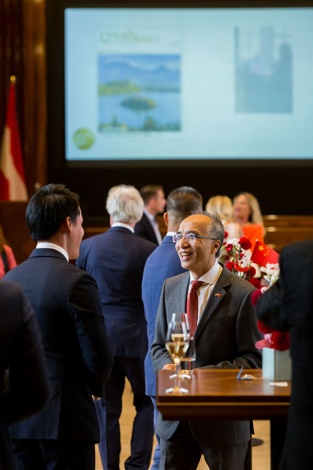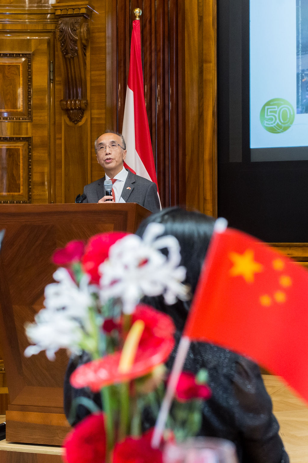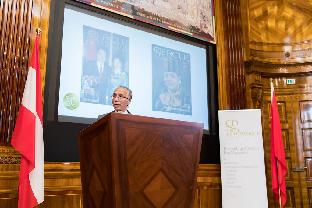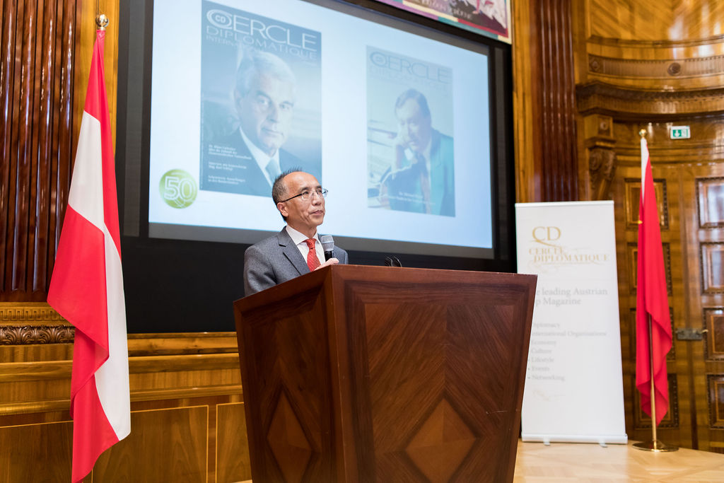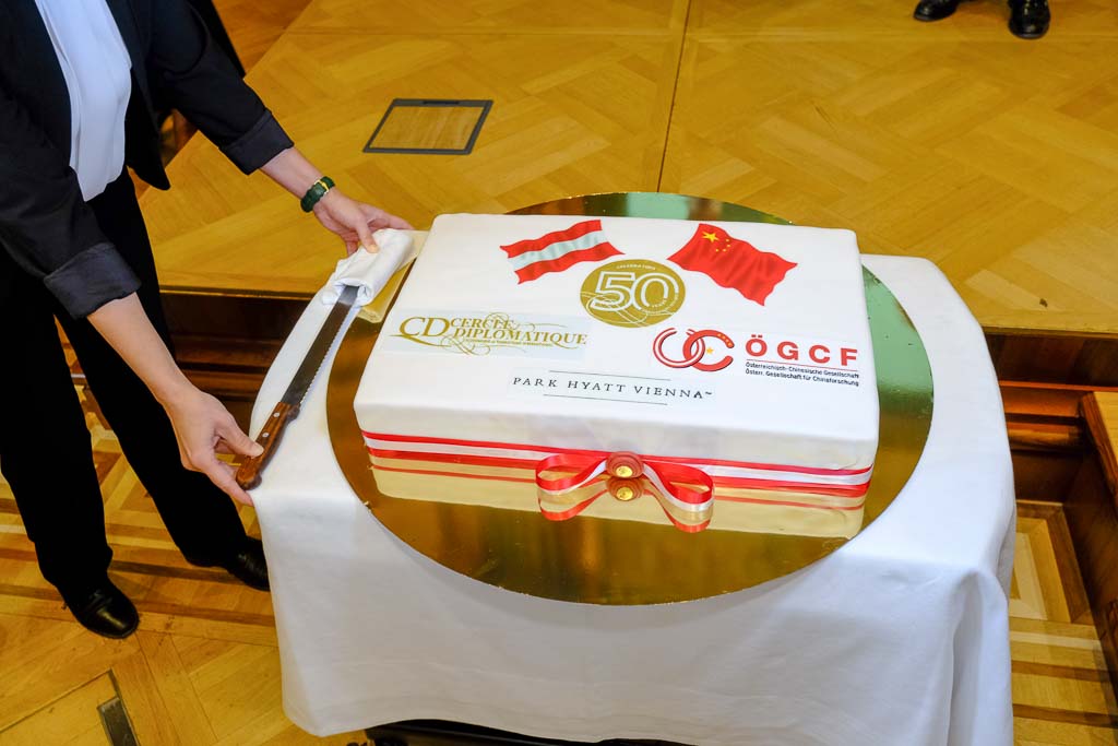 Gleich drei runde Jubiläen wurden gestern gemeinsam im Park Hyatt Vienna gefeiert - 50 Jahre diplomatische Beziehungen zw. der VR China und Österreich, 50 Jahre ÖGCF (Österr.-Chinesische Gesellschaft) und 50 Jahre Cercle Diplomatique Magazin. Den rund 200 geladenen Gästen aus Diplomatie, Wirtschaft, Politik & Gesellschaft wurde in diesem eleganten Rahmen dann auch die 244-Seiten starke Jubiläumsausgabe von Cercle Diplomatique mit einer umfangreichen Coverstory über die VR China präsentiert.