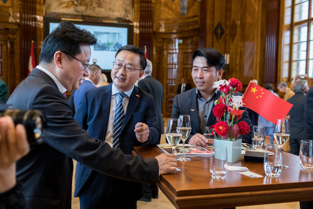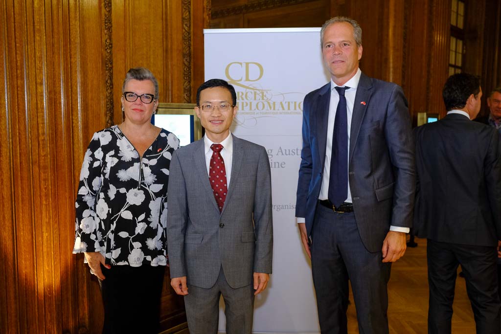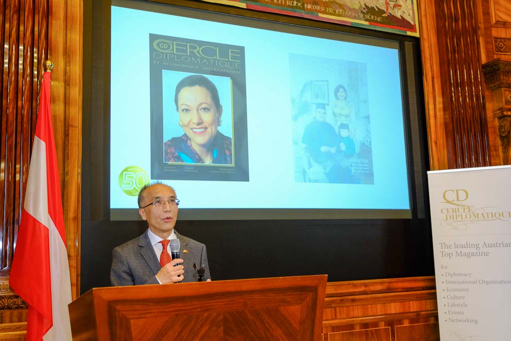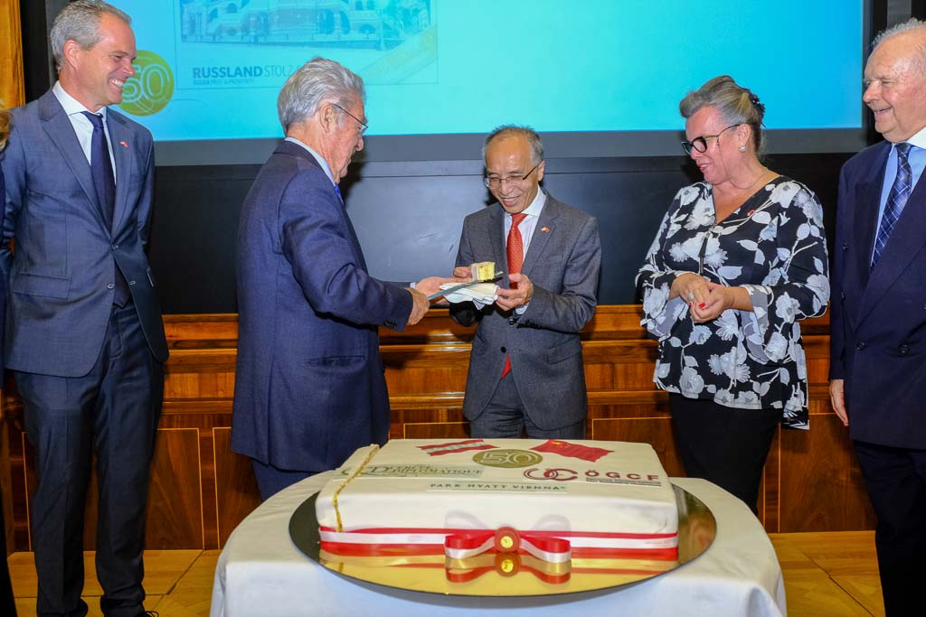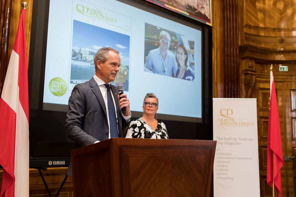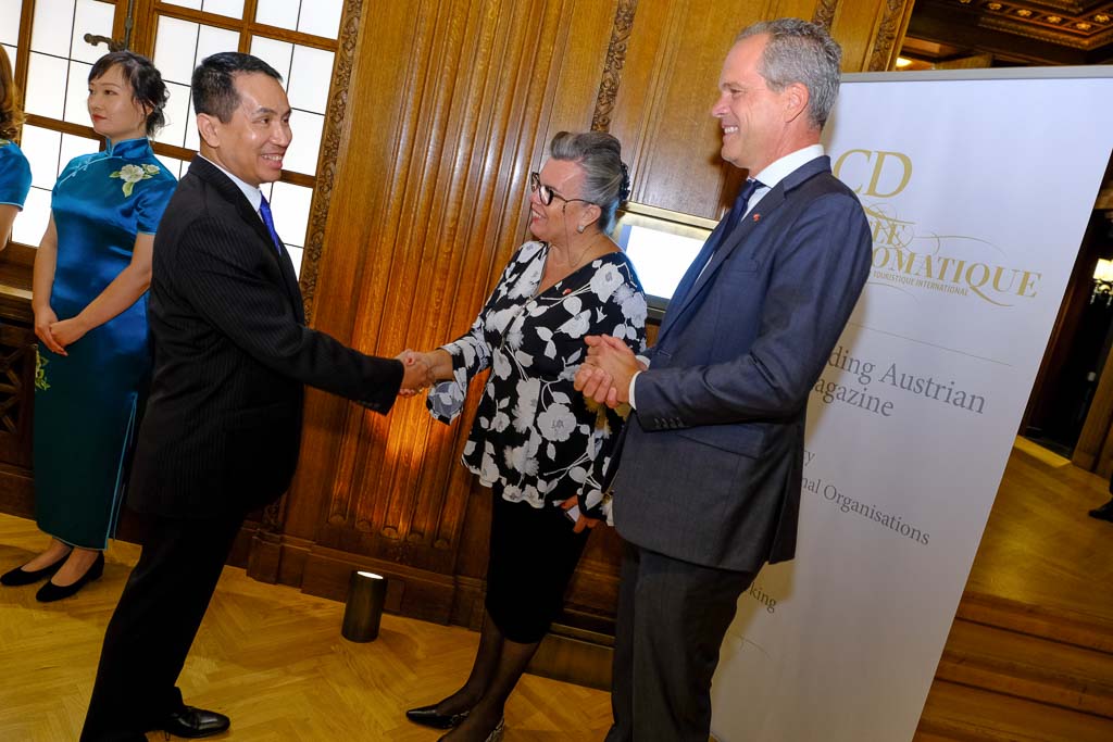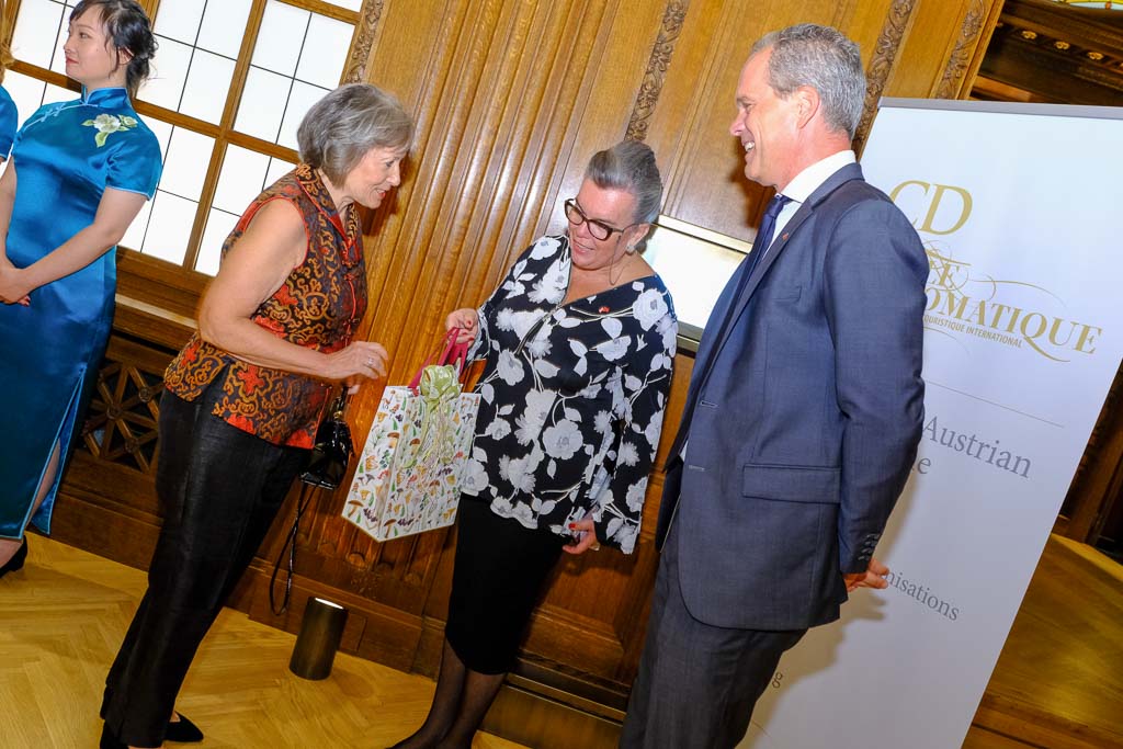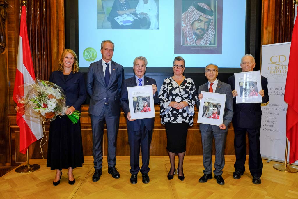 Gleich drei runde Jubiläen wurden gestern gemeinsam im Park Hyatt Vienna gefeiert - 50 Jahre diplomatische Beziehungen zw. der VR China und Österreich, 50 Jahre ÖGCF (Österr.-Chinesische Gesellschaft) und 50 Jahre Cercle Diplomatique Magazin. Den rund 200 geladenen Gästen aus Diplomatie, Wirtschaft, Politik & Gesellschaft wurde in diesem eleganten Rahmen dann auch die 244-Seiten starke Jubiläumsausgabe von Cercle Diplomatique mit einer umfangreichen Coverstory über die VR China präsentiert.
