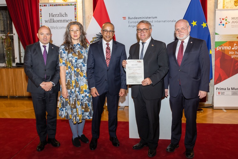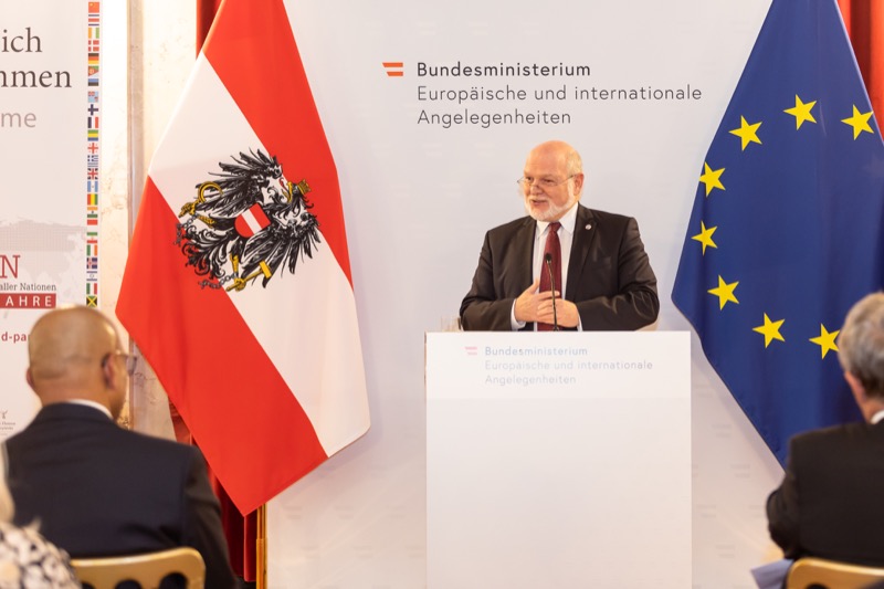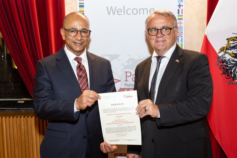 Der jährliche PaN-Preis des Bundesministeriums für europäische und internationalen Angelegenheiten (BMEIA) wurde am 20. Oktober 2021 an die Österreich-Vereinigte Arabische Emirate Gesellschaft (ÖVAEG) verliehen. Festredner im Alois Mock-Saal des Außenministeriums waren S.E. der Botschafter der VAE Ibrahim Salim Almusharrakh, die Leiterin des Kultursektion im BMEIA, Bot. Dr. Teresa Indjein, die den Preis verlieh, Landeshauptmann a.D. Dr. h.c. Hans Niessl, der den Preis entgegennahm, und der Präsident des Dachverbandes-PaN, Univ.-Prof. Dr. Hermann Mückler. Abteilungsleiter Botschafter Martin Pammer führte durch den abendlichen Festakt, der vom prima la musica-Beethoven Streichquartett musikalisch untermalt wurde.