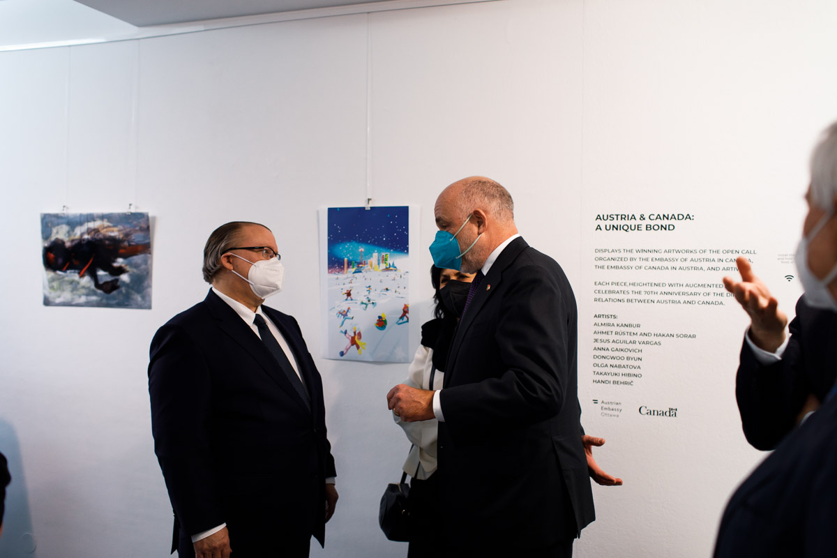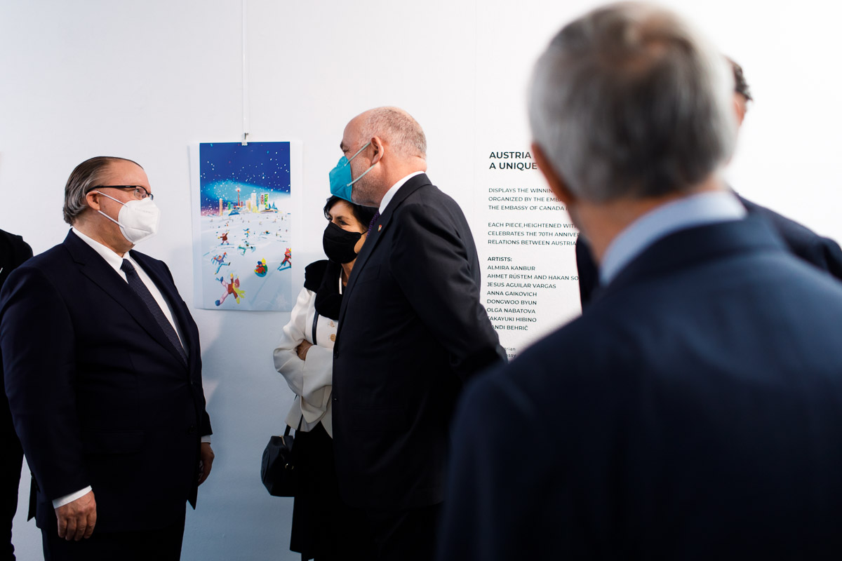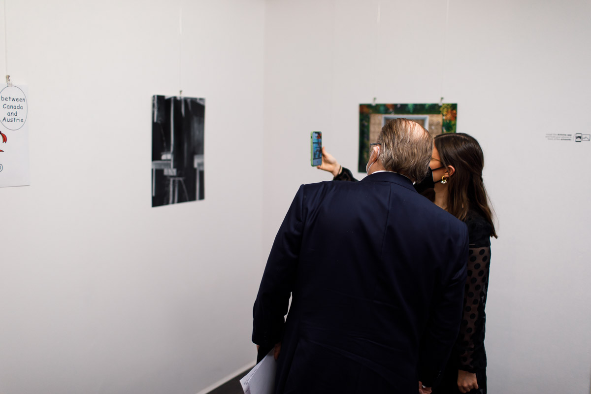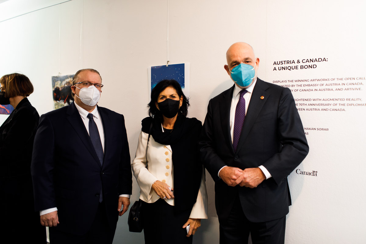Anlässlich der Aufnahme diplomatischer Beziehungen zwischen Österreich und Kanada vor 70 Jahren lud S.E. Troy Lulashnyk, Botschafter von Kanada in Österreich, zu einer Ausstellung, bei der die Siegerkunstwerke des Wettbewerbs "Austria & Canada: a unique bond" zu sehen waren.