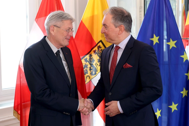 Kärnten bekommt wieder ein deutsches Honorarkonsulat. Darüber tauschten sich heute, Dienstag, Landeshauptmann Peter Kaiser und der deutsche Botschafter Vito Cecere in einem Arbeitsgespräch in der Kärntner Landesregierung aus. Sobald alle entsprechenden Genehmigungen erfolgt sind, sollen deutsche Staatsbürgerinnen und Staatsbürger wieder einen Anlaufpunkt in Klagenfurt haben. Die Eröffnung soll im März 2026 erfolgen, dabei ist auch eine Konferenz zu weiteren Kooperationsmöglichkeiten geplant. Kaiser stellte dem Botschafter Kärnten als Land dar, in dem Industrie und Tourismus nebeneinander funktionieren. Zudem hob er Kärntens Know-how bei Innovationen und erneuerbaren Energien hervor. „Enorme Chancen wird uns die Koralmbahn als Teil der Baltisch-Adriatischen Achse bringen. Diese nutzen wir auch gemeinsam mit der Steiermark sehr gezielt und abgestimmt“, so Kaiser. Er strich insbesondere hervor, dass durch die Koralmbahn 14 verschiedene Hochschulen in Kärnten und der Steiermark vernetzt werden. Viel Potential sieht Botschafter Cecere bei Kooperationen in Wirtschaft und Wissenschaft. Um diese weiterzuentwickeln, werde das neue Honorarkonsulat eine gute Grundlage bieten, sagte er. Derzeit werden Kärnten und die Steiermark gemeinsam von Graz aus betreut. „Ich freue mich schon sehr auf unsere neue Präsenz in Klagenfurt“, so S.E. Cecere.