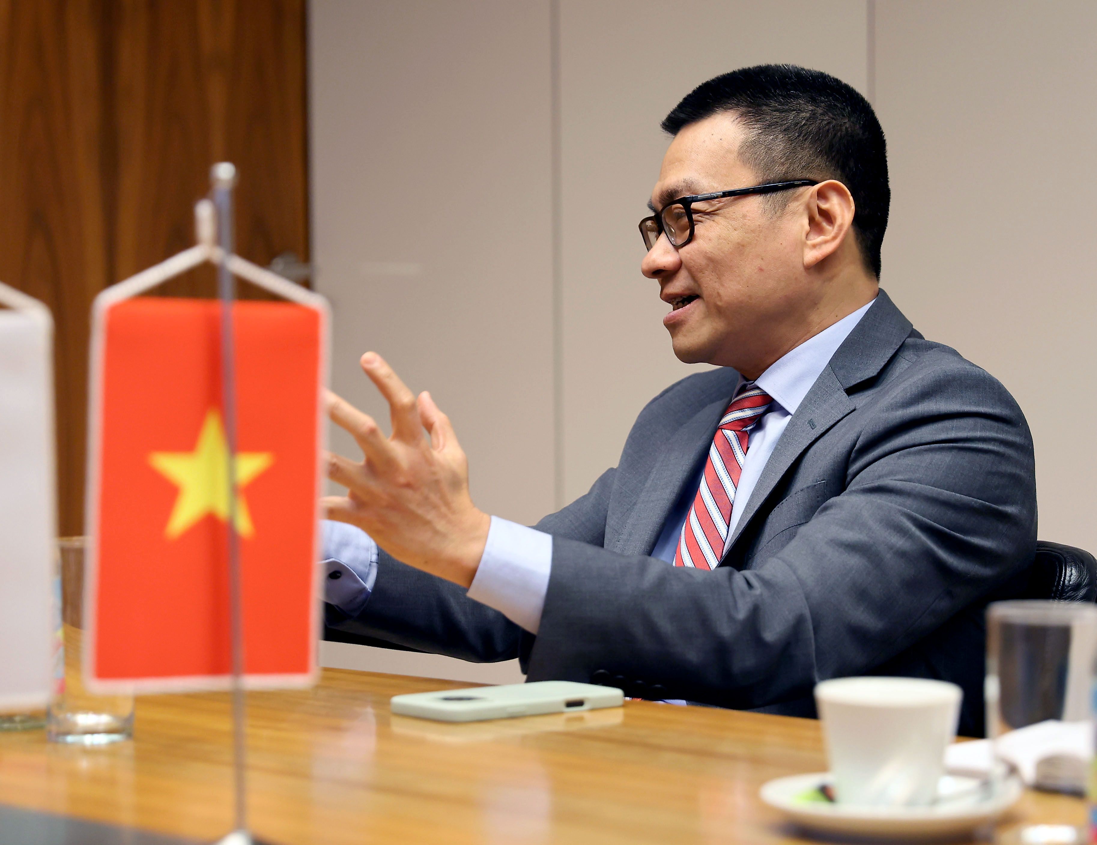 Ziel sei es, die bilateralen Beziehungen mit EU-Staaten weiter auszubauen – unter anderem auch im Tourismus. In diesem Zusammenhang arbeite die Botschaft an der Einrichtung einer Direktflugverbindung zwischen Österreich und Vietnam. Nach jahrzehntelanger Isolation öffnet sich Vietnam auch den ehemals verfeindeten Großmächten, wie den USA, mit denen sie sehr gute strategische und wirtschaftliche Partnerschaften pflegen. „Aktuell legen wir das Stigma des ewigen Schlachtfelds des 20. Jahrhunderts ab und zeigen der Welt, dass wir ein ernstzunehmender und attraktiver Partner sind.“ Vietnam zählt rund 100 Millionen Einwohnerinnen und Einwohner, davon leben etwa 20 Millionen in den Metropolregionen Hanoi und Ho-Chi-Minh-Stadt. Das Land verfolgt eine pragmatische, multilaterale Außenpolitik und pflegt gute Beziehungen zu den USA, zur Europäischen Union, zu China und zu Russland. Vu Le Thai Hoang ist seit Dezember 2024 Botschafter Vietnams in Österreich.